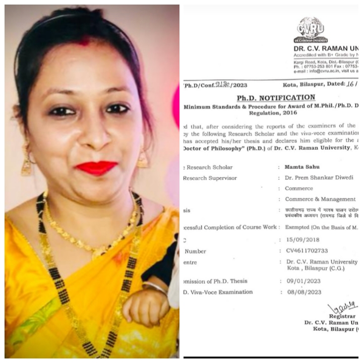 श्री नीलकंठ साहू की पुत्री ममता साहू जो की वर्तमान में रायगढ़ में निवासरत है जिन्होंने डॉ. सी. व्ही. रमन. विश्वविद्यालय बिलासपुर से पीएचडी की उपाधि हासिल कर अपने समाज व जिले का नाम रोशन किया है। ममता के परिजन ने बताया कि उसे बचपन से ही शिक्षा के प्रति काफी रूची थी। वह कोरबा में रहकर कमला नेहरू कॉलेज से एम कॉम की डिग्री हासिल की। उन्होंने बताया डॉ सी. व्ही. रमन विश्वविद्यालय बिलासपुर से पीजीडीसीए एवं एम.फ़िल. की डिग्री प्राप्त करने के पश्चात शोध का विषय *छत्तीसगढ़ राज्य में मत्स्य पालन उद्योग का आर्थिक एवं प्रबंधकीय अध्ययन* “रायगढ़ ज़िले के विशेष संदर्भ में” विषय में डॉ. प्रेमशंकर द्विवेदी के मार्गदर्शन में पीएचडी की उपाधि हासिल कर समाज व जिले का नाम रोशन किया है। उन्होंने बताया कि पीएचडी की उपाधि प्राप्त करने के बाद अपनी आगे की पढ़ाई जारी रखेगी। पीएचडी की उपाधि हासिल करने के बाद उनके परिजनों व समाज के लोगों में काफी खुशी है। साथ ही परिजनों व समाज के लोगों ने उसके सफलता पर बधाई देते हुए उज्जवल भविष्य की कामना की है।ममता साहू में अपनी सफलता का श्रेय अपने माता श्रीमती कमला देवी पिता श्री नीलकंठ साहू तथा भाई बहन एवम् परिवार के सभी सदस्यों को दिया है।