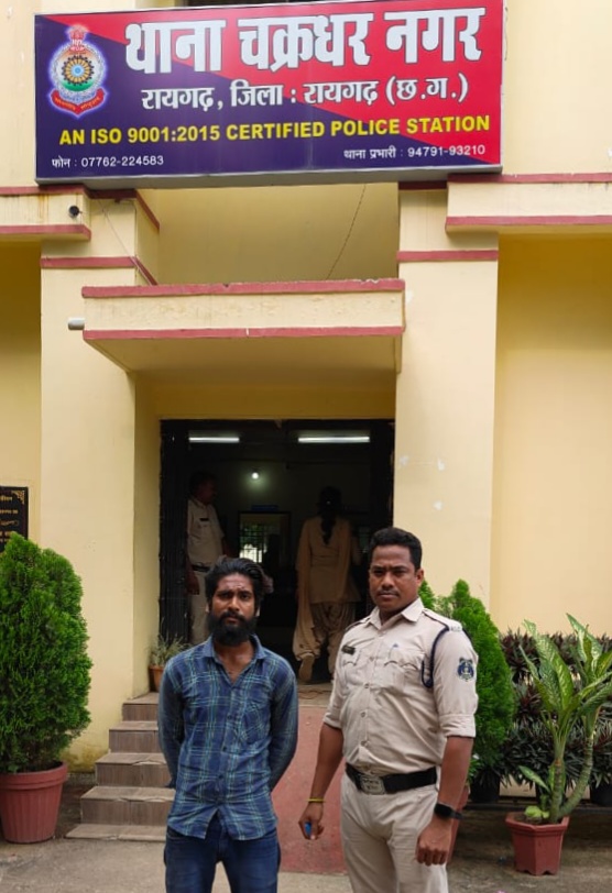 रायगढ़ । आज दिनांक 18/08/2022 के दोपहर थाना प्रभारी चक्रधरनगर निरीक्षक प्रशांत राव आहेर को मुखबीर से सूचना मिला कि एक युवक पंजरी प्लांट रोजगार कार्यालय के पास हाथ में हथियार लिये आने जाने वाले लोगों को डरा धमका रहा है । सूचना पर तत्काल थाना प्रभारी द्वारा थाने के पेट्रोलिंग स्टाफ को मौके पर जाकर तस्दीक और कार्यवाही करने का निर्देश दिये । चक्रधरनगर पेट्रेालिंग मौके पर पहुंची जहां युवक *सूरज यादव पिता सुनील यादव उम्र 20 साल निवासी पंजरी प्लांट थाना चक्रधरनगर* हाथ में एक चाकू लेकर लोगों को डराते धमकाते मिला जिसे सुरक्षा पूर्वक हिरासत में लेकर थाना लाया गया । आरोपी सूरज यादव के कृत्य पर थाना चक्रधरनगर में *धारा 25, 27 आर्म्स एक्ट* की कार्यवाही कर न्यायिक डिमांड पर भेजा गया है ।