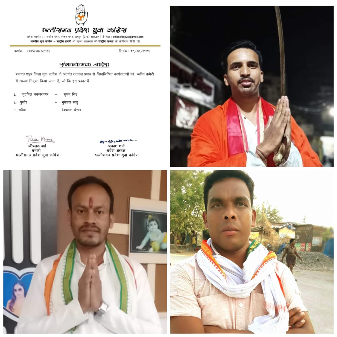 आगामी चुनाव को देखते हुवे अब दोनो ही राष्ट्रीय पार्टियों ने अपनी कमर कस ली है,कांग्रेस पार्टी के सबसे मजबूत युवा विंग युवक कांग्रेस ने भी विधान सभा चुनाव की तैयारिया आरंभ कर दी है,इसी को देखते हुवे युवक कांग्रेस के शीर्ष नेतृत्व ने युवक कांग्रेस के ब्लाक अध्यक्षों की नियुक्ति की है,जिसमें युवक कांग्रेस की छत्तीसगढ़ प्रभारी पलक वर्मा,प्रदेश अध्यक्ष आकाश शर्मा जी द्वारा जिलाध्यक्ष आशीष जायसवाल के अनुसंशा पर जूटमिल चक्रधरनगर जोन का ब्लाक अध्यक्ष शुभम सिंह को बनाया गया,वही पुसौर का ब्लाक अध्यक्ष भुनेश्वर साहू को और सरिया का ब्लाक अध्यक्ष वेद चौहान को बनाया गया है।।नवनियुक्त तीनों ही ब्लाक अध्यक्ष अपने अपने क्षेत्रों में लगातार युवक कांग्रेस को मजबूत करने का काम कर रहे ,इनकी नियुक्ति से पूरे संगठन को और मजबूती मिलेगी।।