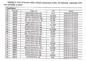 रायगढ़ / रेलवे ने एक बार फिर तुगलक की फरमान जारी कर दिया है जिसमें छत्तीसगढ़ से होकर गुजरने वाली 20 यात्री ट्रेनों को, आज से यानी 23 अगस्त से 3 सितंबर तक रद्द कर दिया गया है दूसरी और तीसरी रेलवे लाइन बिछाई जा रही है और रखरखाव को लेकर सभी ट्रेनों को कैंसिल किया गया है। जिसका सीधा असर आने वाले त्यौहार रक्षाबंधन पर पड़ेगा जिसमें