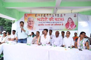 आज इस कार्यक्रम में उपस्थित कार्यकर्ताओं व ग्रामीण भाई बहनों को संबोधित करते हुए विधायक प्रकाश नायक ने कहा कि छत्तीसगढ़ में कांग्रेस की सरकार ने सत्ता पर आते ही अपने किए गए वादों को पूर्ण किया जिसमें किसानों का कर्जा माफ,बिजली बिल माफ व धान की कीमत 2500 जिसे यथा समय पूर्ण कर यशस्वी मुख्यमंत्री भूपेश बघेल के नेतृत्व वाली कांग्रेस सरकार ने जनता का जो विश्वास जीता था वह अभी तक कायम है साथ ही साथ सभी किए 36 वादों में से 1 -2 विषयों को छोड़कर सभी वादों को अपने कार्यकाल में पूर्ण करने में प्रदेश की कांग्रेस सरकार सफल रही है जिसमे प्रदेश के नागरिकों हेतु बेहतर स्वास्थ्य, बच्चों की बेहतर शिक्षा हेतु आत्मानंद अंग्रेजी व हिंदी माध्यम स्कूल,युवाओं को बेरोजगारी भत्ता, रोजगार के नए नए अवसरों का सृजन, कर्मचारियों को पुराना बंद किया पेंशन चालू करवाना ,गरीबों को आवास, बुजुर्गों को पेंशन , कम रकबे की रजिस्ट्री जो भाजपा शासनकाल में रोक दी गई थी उसे प्रारंभ करना, आंगनबाड़ी कार्यकर्ताओं के मानदेय में बढ़ोतरी, नए महाविद्यालय खोलना,धान का समर्थन मूल्य बढ़ाना, प्रति एकड़ धान का अधिक क्रय करना ,महिलाओं का स्व सहायता समूह बना गोठनों के माध्यम से स्वरोजगार उपलब्ध करवाना प्रकाश नायक ने आगे कहा राजीव मितान क्लब के माध्यम से युवाओं को आगे बढ़ाने के कार्य व विभिन्न क्षेत्रों में विकास के कार्यों से कांग्रेस ने सफलतापूर्वक अपना कार्यकाल पूर्ण किया है व इस भरोसे से कांग्रेस अपनी जनकल्याणकारी उपलब्धियों को लेकर नए संकल्पों और प्रदेश के उत्तरोत्तर विकास की योजनाओं के साथ पुनः आपसे आशीर्वाद लेने आप सब के बीच उपस्थित है। कार्यक्रम को संबोधित करते हुए जिला कांग्रेस कमेटी के अध्यक्ष अनिल शुक्ला ने भाजपा की परिवर्तन यात्रा को नाकाम करार देते कहा कि जनता ने परिवर्तन यात्रा को नकार दिया है। इससे यह साबित होता है कि कांग्रेस सरकार के प्रति जनसमर्थन बरकरार है। उन्होंने कहा कि कांग्रेस की इस भरोसा की यात्रा का स्तर भाजपा के परिवर्तन यात्र से काफी ऊंचा है, इसलिए ही भरोसे की ये यात्रा के माध्यम से हम सभी कांग्रेसजन जनता के बीच जाकर सरकार की उपलब्धियों का जमकर प्रचार-प्रसार कर कांग्रेस के भरोसे को पुनः बनाए रखने की अपील कर रहे हैं ।और हमें जबरदस्त जनसमर्थन भी मिल रहा है और उन्होंने आगे कहा कि कांग्रेस पर जो लोगों ने विश्वास किया था उसमें हम शत प्रतिशत खरे उतरे हैं और आगे भी लोगों से इसी भरोसे के साथ हम चुनाव में जा रहे हैं कि हमारी जनकल्याणकारी नीतियों से प्रदेश के हर चेहरे पर मुस्कान हो और उन्हें लगे कि उनका चुना हुआ जनप्रतिनिधि कोई खास व्यक्ति नहीं अपितु उनके बीच का ही है जो जनता के हितों की रक्षा कर सके और अंतिम 