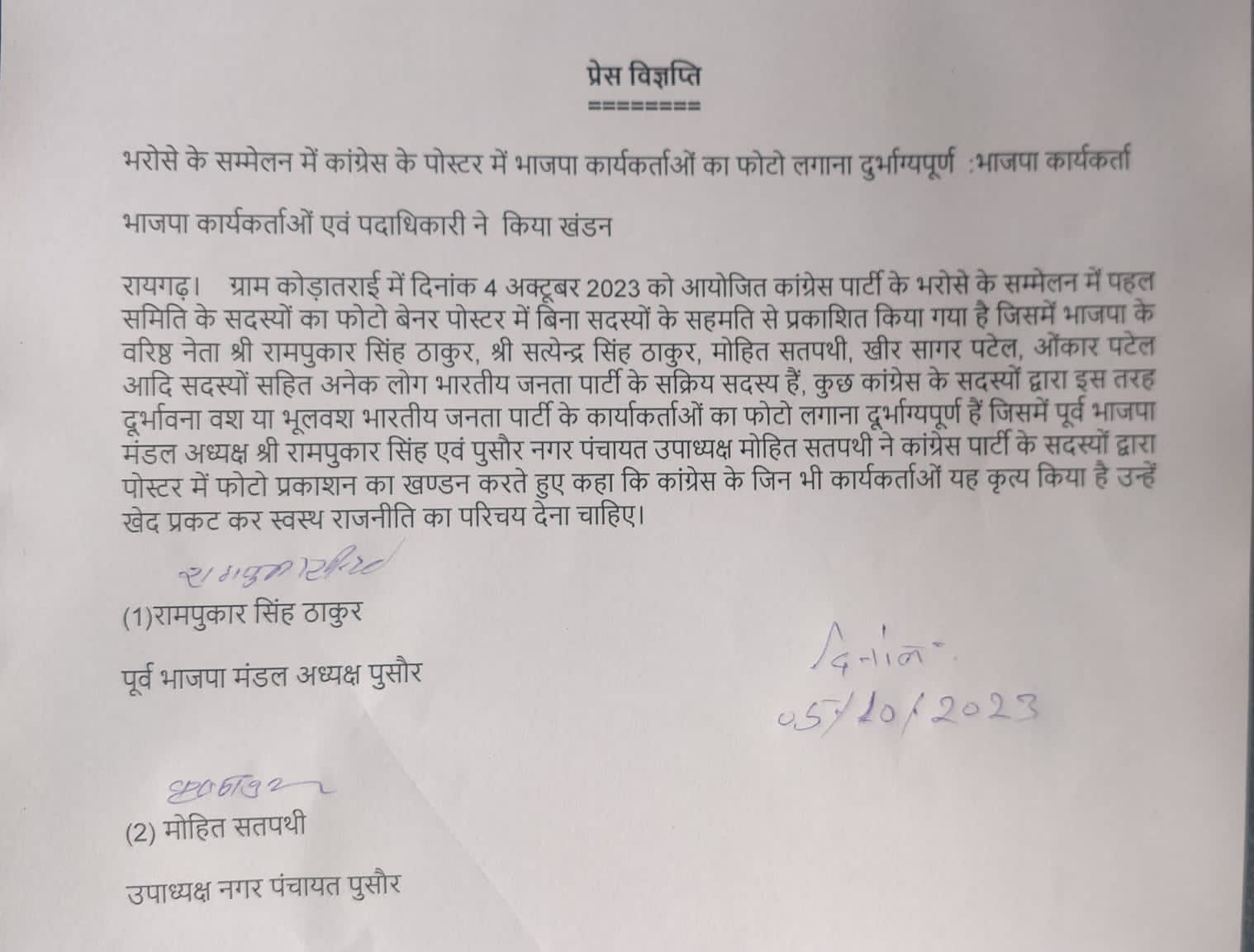 रायगढ़। ग्राम कोड़ातराई में दिनांक 4 अक्टूबर 2023 को आयोजित कांग्रेस पार्टी के भरोसे के सम्मेलन में पहल समिति के सदस्यों का फोटो बेनर पोस्टर में बिना सदस्यों के सहमति से प्रकाशित किया गया है जिसमें भाजपा के वरिष्ठ नेता श्री रामपुकार सिंह ठाकुर, श्री सत्येन्द्र सिंह ठाकुर, मोहित सतपथी, खीर सागर पटेल, ओंकार पटेल आदि सदस्यों सहित अनेक लोग भारतीय जनता पार्टी के सक्रिय सदस्य हैं, कुछ कांग्रेस के सदस्यों द्वारा इस तरह दूर्भावना वश या भूलवश भारतीय जनता पार्टी के कार्याकर्ताओं का फोटो लगाना दूर्भाग्यपूर्ण हैं जिसमें पूर्व भाजपा मंडल अध्यक्ष श्री रामपुकार सिंह एवं पुसौर नगर पंचायत उपाध्यक्ष मोहित सतपथी ने कांग्रेस पार्टी के सदस्यों द्वारा पोस्टर में फोटो प्रकाशन का खण्डन करते हुए कहा कि कांग्रेस के जिन भी कार्यकर्ताओं यह कृत्य किया है उन्हें खेद प्रकट कर स्वस्थ राजनीति का परिचय देना चाहिए।