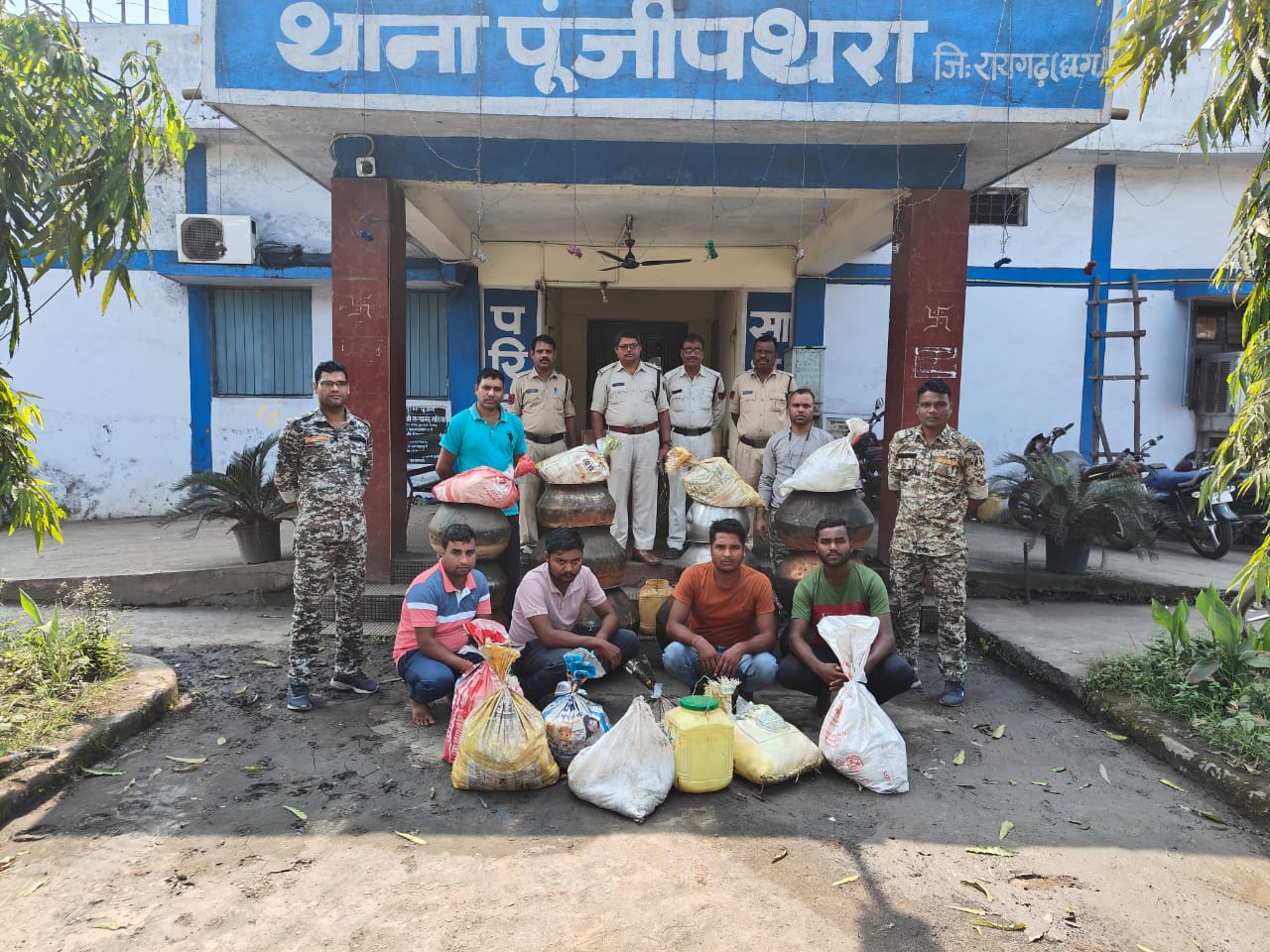 रायगढ़ । वरिष्ठ पुलिस अधीक्षक श्री सदानंद कुमार के निर्देशन पर कल 8 अक्टूबर के शाम नव पदस्थ थाना प्रभारी पूंजीपथरा निरीक्षक कृष्णकांत सिंह के नेतृत्व में पूंजीपथरा पुलिस द्वारा ग्राम गेरवानी डीपापारा में अलग-अलग स्थान में शराब रेड कार्यवाही किया गया । पूंजीपथरा पुलिस को सूचना मिली थी कि गांव के कुछ लोग अवैध रूप से महुआ शराब की आसपास क्षेत्र में बिक्री करते हैं । थाना प्रभारी पूंजीपथरा द्वारा एसएसपी सदानंद कुमार, एडिशनल एसपी संजय महादेवा डीएसपी निकिता तिवारी को अवैध गतिविधियों की जानकारी से अवगत कराकर उनके मार्गदर्शन पर शराब रेड कार्रवाई के लिये थाना स्टाफ की टीम तैयार किया गया और सुनियोजित तरीके से इलाके की घेराबंदी कर शराब रेड कार्यवाही की गई जिसमें चार आरोपी अशोक अजय, राजेंद्र बर्मन, सरोज कुमार जाटवार और सुरेश कुमार खुंटे को अलग-अलग स्थान से पुलिस पार्टी ने शराब के साथ पकड़ा । आरोपियों के पास से 200-200 ml भरा हुआ महुआ शराब की *कुल 1200 पाऊच (240 लीटर महुआ शराब) कीमत ₹24,000* का जप्त किया गया है । आरोपियों पर थाना पूंजीपथरा में पृथक पृथक आबकारी एक्ट की धारा 34(2),59(क) के तहत कार्यवाही कर आरोपियों को जेल भेजा गया है । शराब रेड कार्यवाही में थाना प्रभारी पूंजीपथरा निरीक्षक कृष्णकांत सिंह, सहायक उप निरीक्षक विजय एक्का, प्रधान आरक्षक नंद साय कंवर, आरक्षक बालचंद राव, धर्मेन्द्र प्रताप सिंह, अभिषेक द्विवेदी, नरेन्द्र पैंकरा, इमानवेल कुजूर और राजेश बंजारे शामिल थे ।