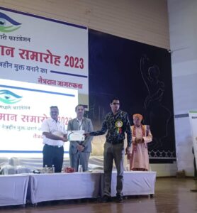 सम्मान किया गया वहीं विभिन्न कार्यक्रम भी किए गए देवकी रामधारी फाउंडेशन को 5000 से अधिक नेत्रदानियो के संकल्प हेतु गोल्डन बुक ऑफ द वर्ल्ड रिकॉर्ड में नाम दर्ज करते हुए डॉक्टर बिश्नोई के द्वारा दीपक डोरा को प्रमाण पत्र देते हुए सम्मानित किया गया वही नेत्र दान एवं देहदान हेतु प्रेरित करने के लिए जागरूकता गीत का विमोचन डीआईजी एवं डॉक्टर बिश्नोई जी के द्वारा किया गया विमोचित गीत की रचना गीतकार संतोष शर्मा के द्वारा की गई वहीं शहर के लोक गायक दीपक आचार्य एवं देहदानी यूथ आईकॉन विजय शर्मा द्वारा गीत को स्वर दिया गया बता दें जब मंच से गीत “यह देहदान यह नेत्रदान भगवान की सच्ची भक्ति है मरकर भी जो काम आ सके इंसान में ही वह शक्ति है” ।