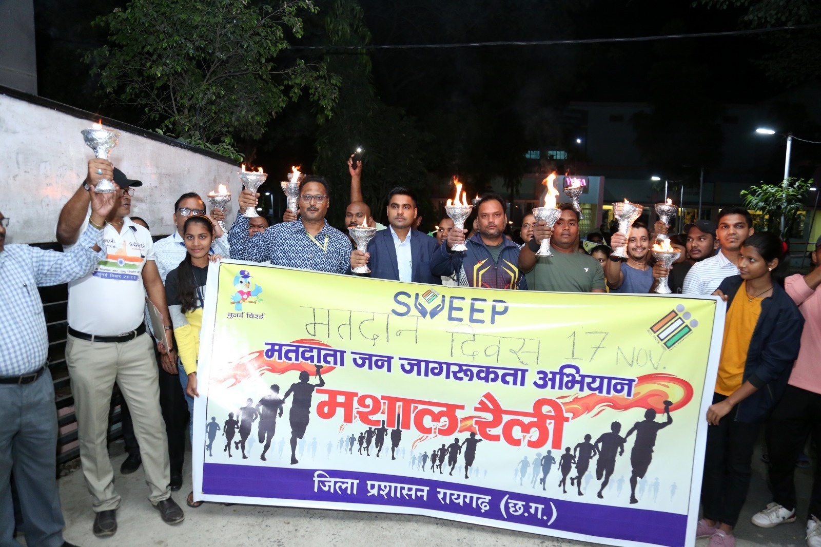 रायगढ़, 1 नवम्बर 2023/ विधानसभा आम निर्वाचन-2023 के मद्देनजर कलेक्टर एवं जिला निर्वाचन अधिकारी श्री कार्तिकेया गोयल के निर्देशन में मतदाता जन जागरूकता अभियान के तहत बोईरदादर स्टेडियम से जिला प्रशासन एवं एनएसएस के विद्यार्थियो ने मशाल रैली निकाली।