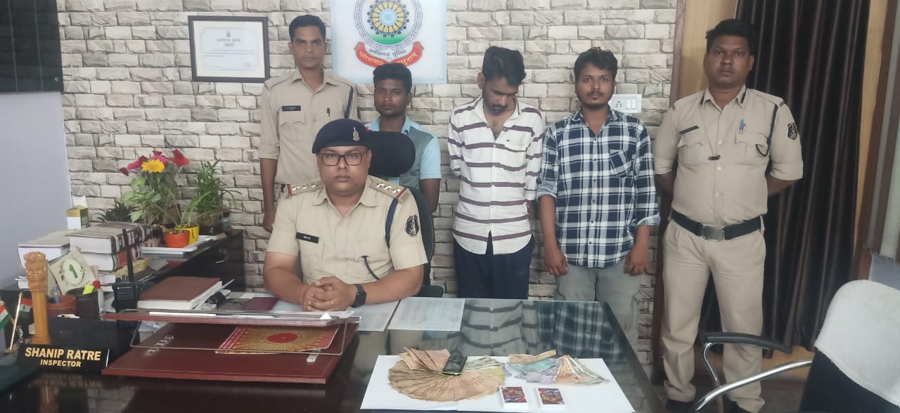 रायगढ़ । कल दिनांक 01.11.2023 के शाम थाना प्रभारी कोतवाली निरीक्षक शनिप रात्रे द्वारा वरिष्ठ पुलिस अधीक्षक श्री सदानंद कुमार के निर्देशन एवं एडिशनल एसपी संजय महादेवा व सीएसपी अभिनव उपाध्याय के मार्गदर्शन पर अवैध शराब एवं जुआ-सट्टा पर कार्यवाही थाने के विवेचकों की अलग-अलग टीमें बनाकर विभिन्न स्थानों पर दबिश दिया गया । कार्यवाही दौरान पुलिस टीम ने रामगुड़ी पारा और नया शनि मंदिर के सामने रोड़ पर 52 पत्ती ताश से जुआ खेलते 6 आरोपी (1) राजा आलम पिता अख्तर उम्र 24 साल टिकरापारा इंदिरा नगर थाना कोतवाली (2) राधेश्याम उर्फ राजा अग्रवाल पिता मुरारी लाल अग्रवाल उम्र 45 साल बेलादुला थाना चक्रधरनगर जिला रायगढ़ (3) प्रेम शंकर सिदार पिता दिल साय सिदार दर उम्र 24 साल जूटमिल समाधि गली थाना जूटमिल रायगढ़ (4) नागेश बरेठ पिता स्वर्गीय दशरथ बरेठ उम्र 38 साल निवासी चांदनी चौक धोबी पारा थाना कोतवाली जिला रायगढ़ (5) विक्रम पुरसेठ पिता सलिकराम पुरसेठ उम्र 48 साल निवासी रामगुड़ी पारा थाना कोतवाली रायगढ़ (6) शंकर निषाद पिता चेतराम निषाद उम्र 32 साल निवासी तेलीपारा थाना कोतवाली रायगढ़ को पकड़ा गया जिनसे कुल 4,650 रूपये नकद एवं 52 पत्ती ताश के दो गड्डी जप्त किया गया है । वहीं ढिमरापुर चौक मुख्य मार्ग में शराब रेड कर आरोपी राजेश कुमार साहू पिता शौकीलाल साहू उम्र 43 वर्ष निवासी डुमरपाली थाना भुपदेवपुर रायगढ़ को पकड़ा गया है । आरोपी से 18 पाव देशी प्लेन शराब की जप्ती की गई है । टीआई शनिप रात्रे के नेतृत्वव में जुआ, शराब रेड कार्रवाई में प्रधान आरक्षक हेमंत पात्रे, विक्रम चौरसिया, अरूणा चौरसिया, आरक्षक जगमोहन ओग्रे, कोमल तिवारी और घनश्याम ध्रुव शामिल थे ।