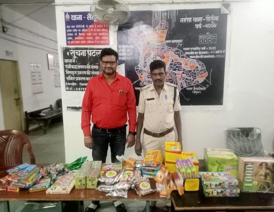 रायगढ़ । वरिष्ठ पुलिस अधीक्षक श्री सदानंद कुमार के दिशा निर्देशन पर एवं अतिरिक्त पुलिस अधीक्षक श्री संजय महादेवा, एसडीओपी धरमजयगढ़ श्री दीपक मिश्रा के मार्गदर्शन में विधानसभा चुनाव को लेकर विभिन्न गतिविधियों पर नजर रखकर लगातार कार्रवाई की जा रही है । इसी तारतम्य में कल दिनांक 02.11.2023 को क्षेत्र में पेट्रोलिंग के दौरान मुखबिर से सूचना पर थाना प्रभारी लैलूंगा निरीक्षक मोहन भारद्वाज के नेतृत्व में लैलूंगा-रायगढ़ रोड़ में कन्हैया अग्रवाल द्वारा एवं ग्राम झागरपुर में कमलेश अग्रवाल द्वारा के किराना दुकान में अवैध रूप से फटाखा रखकर बिक्री की सूचना पर रेड कार्यवाही किया गया । दोनों व्यक्ति – कन्हैया अग्रवाल पिता बंसीधर अग्रवाल उम्र 46 साल निवासी लेलूंगा थाना लैलूंगा जिला रायगढ़ एवं कमलेश कुमार अग्रवाल पिता मांगेराम अग्रवाल उम्र 42 साल निवासी ग्राम झगरपुर थाना लैलूंगा जिला रायगढ़ को लैलूंगा पुलिस स्टाफ द्वारा फटाका रखने एवं बिक्री करने के संबंध में वैध दस्तावेज पेश करने नोटिस दिया गया जो वैद्य दस्तावेज पेश करने में असफल रहे जिससे दोनों व्यक्तियों के कब्जे से विभिन्न प्रकार के फटाखा जब्त कर थाना लैलूंगा में विस्फोटक अधिनियम के तहत विधिवत कार्यवाही की गई है ।