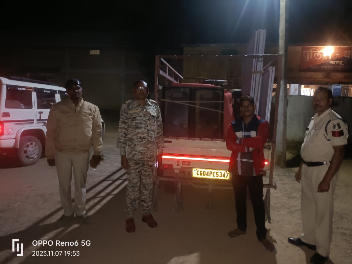 रायगढ़ । कल दिनांक 07/11/2023 को थाना प्रभारी कापू निरीक्षक नारायण सिंह मरकाम अपने स्टाफ के साथ थाना क्षेत्र में भ्रमण पर थे । इस दौरान ग्राम तालगांव चौक के पास एक छोटा हाथी वाहन सीजी 04 पीसी – 5347 में ध्वनि विस्तारक यंत्र लगाकर प्रचार कर रहे वाहन को रोक कर चेक किया गया । वाहन में बज रहे ध्वनि विस्तारक यंत्र से आने-जाने वाले राहगीर परेशान हो रहे थे । चालक आत्माराम धृत लहरे से थाना प्रभारी द्वारा वाहन पर ध्वनि विस्तारक यंत्र के जरिये प्रचार करने की अनुमति के कागजात की मांग किया गया । मौके पर वाहन चालक ने किसी प्रकार के कागजात नहीं बताया । थाना प्रभारी द्वारा गवाहों के समक्ष वाहन एवं वाहन में रखे 2 नग साउंड बॉक्स, फ्लेक्सी की जप्ती कर अनावेदक आत्माराम धृत लहरे पिता महेश राम उम्र 24 साल निवासी गोडारी थाना व जिला महासमुंद पर कोलाहल अधिनियम नियंत्रण 1985 की धारा 10, 11, 15 के तहत कार्रवाई किया गया है ।