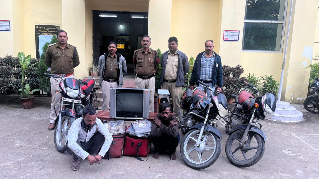 रायगढ़ । वरिष्ठ पुलिस श्री सदानंद कुमार के दिशा निर्देशन एवं एडिशनल एसपी श्री संजय महोदवा के मार्गदर्शन पर चोरियों पर अंकुश लगाने थाना प्रभारीगण क्षेत्र में मुखबिर लगाकर संदिग्धों पर नजर रखी जा रही है । इसी क्रम में आज दिनांक 09.12.2023 के दोपहर थाना प्रभारी चक्रधरनगर निरीक्षक प्रशांत राव अहेर को मुखबिर से सूचना मिला कि चक्रधरनगर चौक पर दो व्यक्ति मोटरसाइकिल बेचने ग्राहक की तलाश में है । सूचना पर तत्काल थाना प्रभारी अपने स्टाफ के साथ मौके पर पहुंचकर दोनों संदेहियों को तलब किये, पूछताछ पर एक ने अपना नाम सुनील देवांगन उर्फ़ सुशील निवासी हाउसिंग बोर्ड कॉलोनी चक्रधरनगर और दूसरे ने रोशन शर्मा उर्फ मुसद्दी निवासी बड़बिल (उड़ीसा) का रहने वाला बताया । दोनों की गतिविधियां संदिग्ध प्रतीक होने पर उनसे हिकमत अमली से पूछताछ करने पर उन्होंने शहर में मोटरसाइकिल तथा टीवी, कंप्यूटर, कपड़े आदि की चोरी करना बताये । आरोपियों को हिरासत में लेकर थाना लाया गया जिनका विस्तृत मेमोरेंडम कथन लिया गया और आरोपी सुनील देवांगन उर्फ़ सुशील के घर दबिश देकर आरोपी के मेमोरेंडम पर गवाहों के समक्ष – दो एचएफ डीलक्स मोटरसाइकिल सीजी 13 ए 2630 एवं सीजी 13 ए.डी. 0157, एक 21 इंच सैमसंग कंपनी का टीवी, एक सीपीयू, 20 नग नये शर्ट एवं 7 नग फुल पैंट बरामद कर विधिवत जप्ती की गई । वहीं आरोपी रोशन शर्मा उर्फ मुसद्दी के निशांदेही पर आरोपियों द्वारा मरीन ड्राइव रोड किनारे छुपा कर रखा एक बिना नंबर मोटरसाइकिल बजाज प्लैटिना बरामद किया गया है । आरोपियों से जप्त चोरी की मसरूका के संबंध में थाना चक्रधरनगर में आरोपियों पर धारा 41(1+4)CrPC/379,34 IPC के तहत कार्यवाही कर दोनों आरोपी (1) सुनील देवांगन उर्फ़ सुशील पिता स्वर्गीय गंगाराम देवांगन उम्र 30 साल निवासी हाउसिंग बोर्ड कॉलोनी थाना चक्रधरनगर जिला रायगढ़ (2) रोशन शर्मा उर्फ मुसद्दी पिता राजेंद्र शर्मा उम्र 32 साल निवासी पुराना बस स्टैंड सेडैंग, थाना व जिला बड़बिल (उड़ीसा) को न्यायिक रिमांड पर भेजा गया है । सम्पूर्ण कार्यवाही में थाना प्रभारी चक्रधरनगर निरीक्षक प्रशांत राव के हमराह रहे प्रधान आरक्षक संजय तिवारी, रविकिशोर साय, आरक्षक चंद्रकुमार बंजारे, शांति कुमार मिरी और अभय नारायण यादव की अहम भूमिका रही है ।