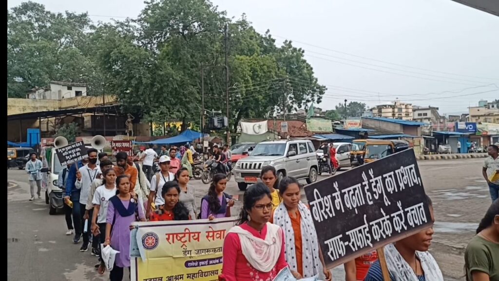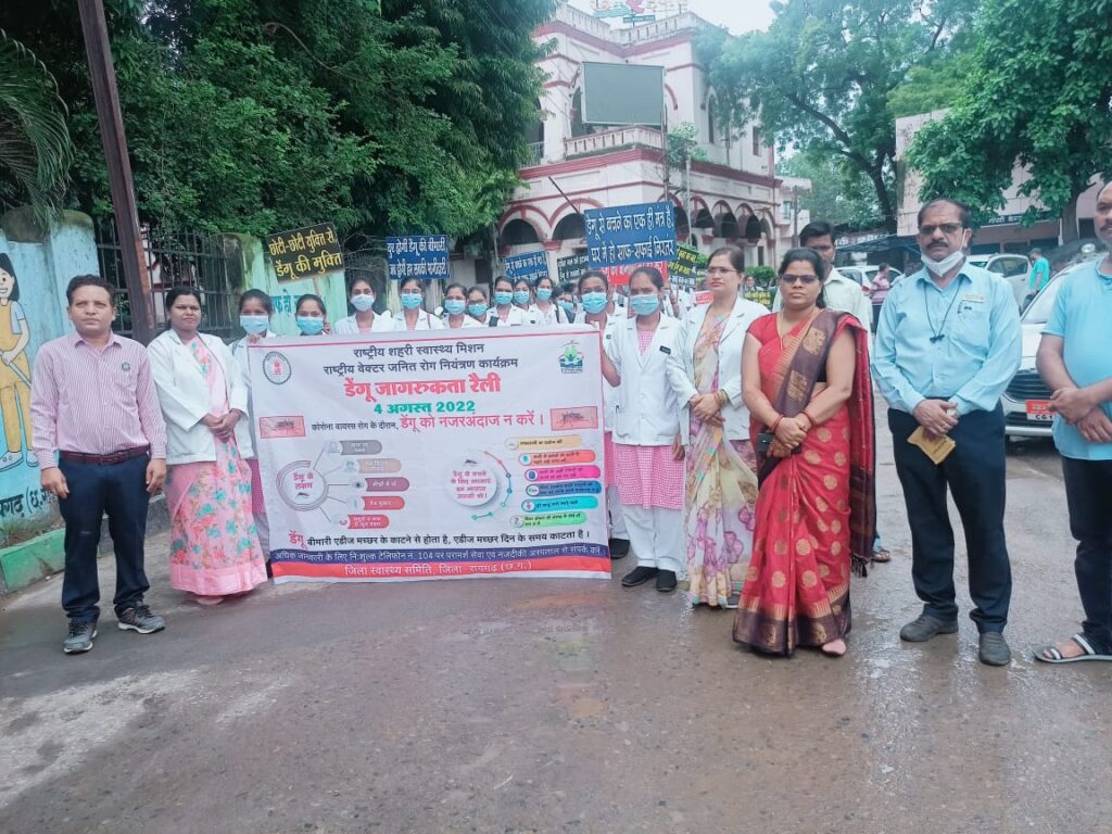 एनएसएस के विश्वविद्यालय कार्यक्रम समन्वयक डॉ. सुशील कुमार एक्का जिला संगठक भोजराम पटेल एवं विभिन्न संस्थाओं के कार्यक्रम अधिकारियों सहित स्वयंसेवकों की वृहद उपस्थिति रही । डेंगू से बचाव के लिए लोगों को जागरूक करने संबंधी प्रेरक नारा एवं उद्बोधन करते हुए लोगों को डेंगू से बचाव के सुरक्षात्मक उपाय लाउडस्पीकर से ऐलान के साथ स्वास्थ्य विभाग एवं एनएसएस स्वयंसेवकों की रैली नगर पालिक निगम से निकलकर सदर बाजार मुख्य मार्ग होते हुए सुभाष चौक से गांधी चौक एवं बेटी बचाओ बेटी पढ़ाओ स्टेशन चौक होकर सांसद निवास से दरोगापारा में प्रवेश कर कलेक्टर बंगला के पास निकली जहां से सत्ती गुड़ी चौक एवं घड़ी चौक होते हुए हंडी चौक से कोतवाली रोड में बढ़ कर मुख्य मार्ग से गुजरते हुए पुनः नगर पालिक निगम तक पहुंची इस रैली में जहां स्वास्थ्य