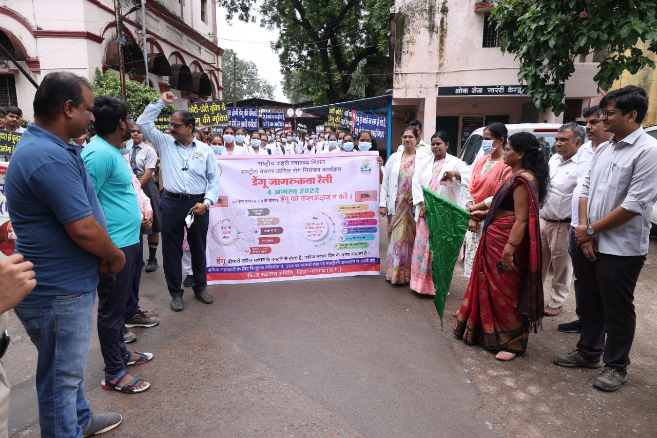 रायगढ़ / नगर को डेंगू मुक्त बनाने के लिए जिला कलेक्टर श्रीमती रानू साहू के निर्देश पर स्वास्थ्य विभाग द्वारा नगर पालिक निगम के सहयोग से डेंगू से बचाव जागरूकता रैली का आयोजन 4 अगस्त को एनएसएस स्वयंसेवकों की सहभागिता में किया गया रैली का शुभारंभ कलेक्टर श्रीमती रानू साहू एवं महापौर श्रीमती जानकी काटजू ने हरा झंडा दिखाकर किया इस अवसर पर नगर पालिक निगम आयुक्त संबीत मिश्रा सीएमएचओ एस.एन. केसरीपार्षद शाखा यादव स्वच्छता प्रभारी संजय देवांगन अन्य पार्षद गण एवं प्रभारी अधिकारी स्वास्थ्य विभाग राकेश वर्मा नगर पालिक निगम एवंं स्वास्थ्य के कर्मचारी
