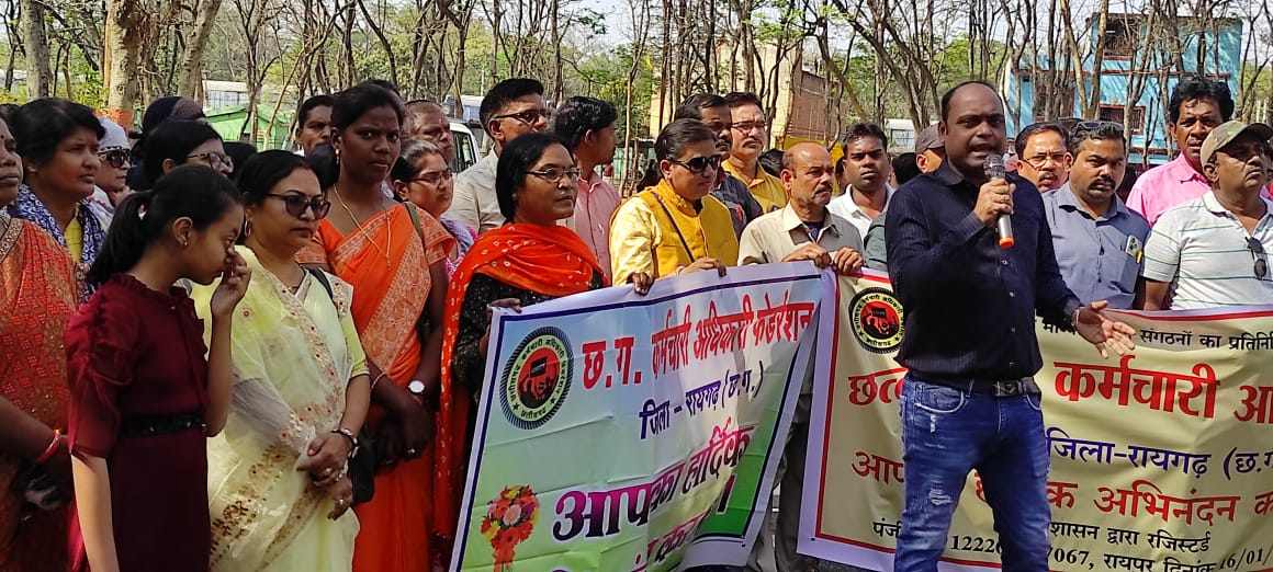 रायगढ़ :- कर्मचारी हितों पर “मोदी की गारंटी” के अमल को लेकर छत्तीसगढ़ कर्मचारी अधिकारी फेडरेशन जिला रायगढ़ ने रैली निकालकर प्रदर्शन करते हुए माननीय मुख्यमंत्री छत्तीसगढ़ शासन श्री विष्णु देव साय जी के नाम कलेक्टोरेट रायगढ़ में डिप्टी कलेक्टर श्री महेश शर्मा को ध्यानाकर्षण ज्ञापन सौंपा। राज्य के कर्मचारी व पेंशनरों को केंद्र के समान चार प्रतिशत डीए देय तिथि से,घोषणा पत्र अनुसार जुलाई 2019 से लंबित डीए की एरिएर्स राशि को जीपीएफ खाते में समायोजित करने, वेतन विसंगति एवं अन्य मुद्दे के लिए गठित पिंगुआ कमेटी की रिपोर्ट सार्वजनिक करने व सातवें वेतनमान के एरियर्स की राशि की अंतिम 6 वीं किस्त का भुगतान शीघ्र किए जाने संबंधी अपनी चार सूत्रीय मांगों को लेकर आज छत्तीसगढ़ शासन द्वारा मान्यता प्राप्त संगठनों के प्रतिनिधि संगठन “छत्तीसगढ़ कर्मचारी अधिकारी फेडरेशन जिला रायगढ़” ने जिले के विभिन्न विभागों के सैकड़ों कर्मचारियों के साथ रैली निकालकर प्रदर्शन करते हुए अपनी आवाज बुलंद की।जिला फेडरेशन रायगढ़ के संयोजक श्री आशीष रंगारी ने कहा कि,”कर्मचारियों की सुधि लेते हुए मोदी गारंटी पर अमल शीघ्र हो”। विदित हो कि, विधानसभा निर्वाचन 2023 में मोदी की गारंटी को लेकर वर्तमान सरकार द्वारा संकल्प पत्र जारी किया गया था। उक्त संकल्प पत्र में कर्मचारियों की मांगों का उल्लेख किया गया था ,और कहा गया था कि, “यह संकल्प संकल्प केवल नही, मोदी की गारंटी है”। बजट सत्र में भी सरकार द्वारा कर्मचारियों के वादे के रूप में दी गई मोदी की गारंटी के तहत कोई भी बजट राशि का प्रावधान तथा आज पर्यंत महंगाई भत्ता की घोषणा नहीं होने के कारण प्रदेश भर के कर्मचारी अधिकारियों एवं पेंशनरों में निराशा है।