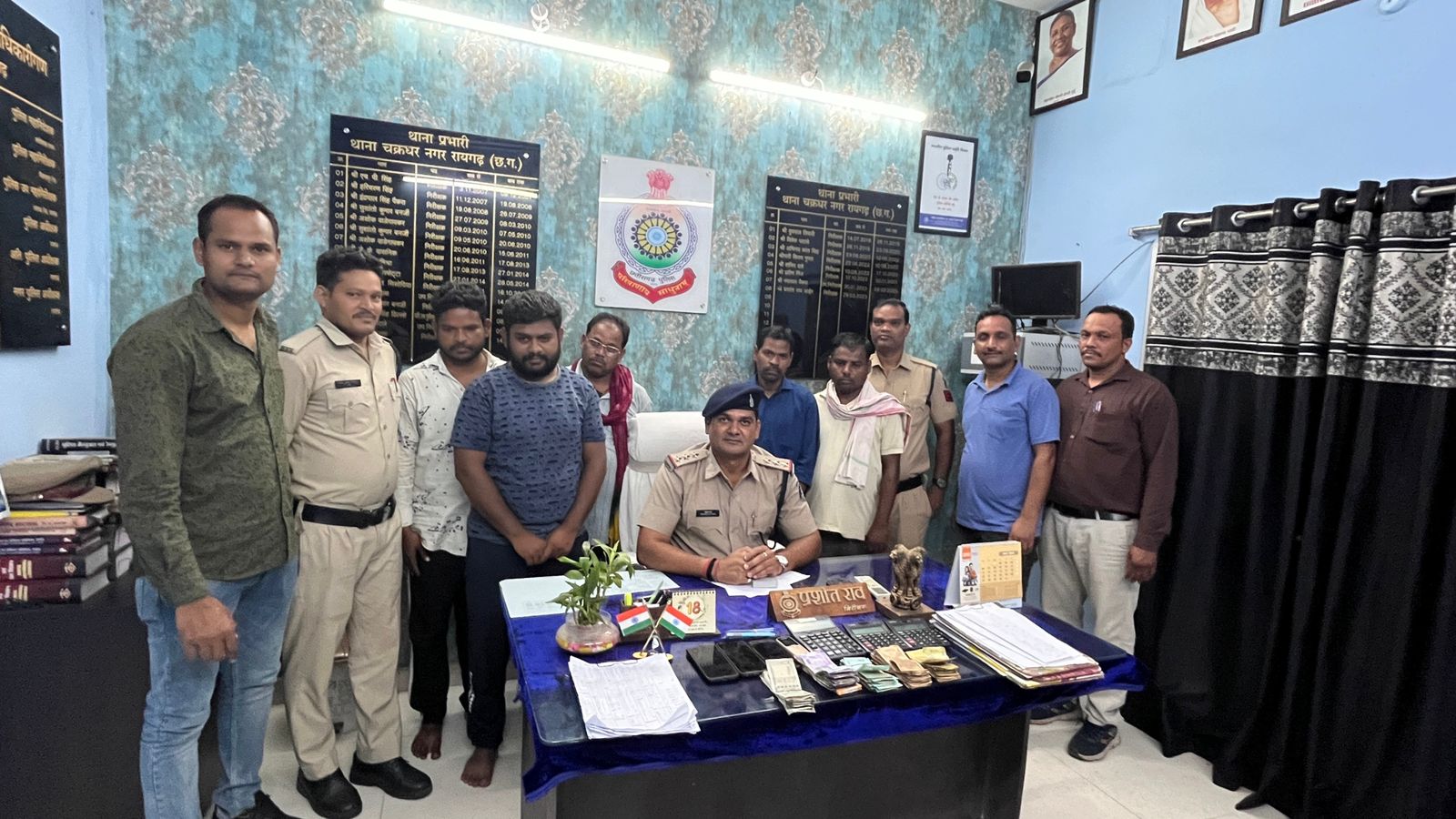 18 मई रायगढ़ । प्रभारी पुलिस अधीक्षक श्री योगेश कुमार पटेल के दिशा निर्देशन पर आज शाम थाना चक्रधरनगर एवं साइबर सेल की संयुक्त टीम द्वारा सक्रिय मुखबीरों से सूचना प्राप्त कर चक्रधरनगर क्षेत्र में पांच स्थानों पर सट्टा रेट कार्यवाही किया गया । पुलिस टीम ने सट्टा-पट्टी लिखते 05 आरोपी- रवि देवांगन, महेश जायसवाल, दिनेश पटेल, शिव विश्वकर्मा और विजय यादव को पकड़ा है जिससे ₹16,630 रुपए नगद, 04 मोबाइल, 03 कैलकुलेटर, पेन और सट्टा-पट्टी की जप्ती की गई है । आरोपियों पर थाना चक्रधरनगर में छत्तीसगढ़ जुआ प्रतिषेध अधिनियम के तहत कार्यवाही किया जा रहा है । सट्टा-पट्टी पर अंकुश लगाने आगे भी पुलिस की कार्रवाई जारी रहेगी । थाना प्रभारी चक्रधरनगर निरीक्षक प्रशांत राव आहेर के नेतृत्व में सट्टा रेड कार्यवाही में प्रधान आरक्षक श्याम देव साहू, संजय तिवारी, सुमन चौहान आरक्षक नरेंद्र भारद्वाज, कोमल तिवारी तथा साइबर सेल के प्रधान आरक्षक राजेश पटेल, दुर्गेश सिंह, आरक्षक महेश पंडा, पुष्पेंद्र जाटवर, नवीन शुक्ला, और विक्रम सिंह शामिल थे ।