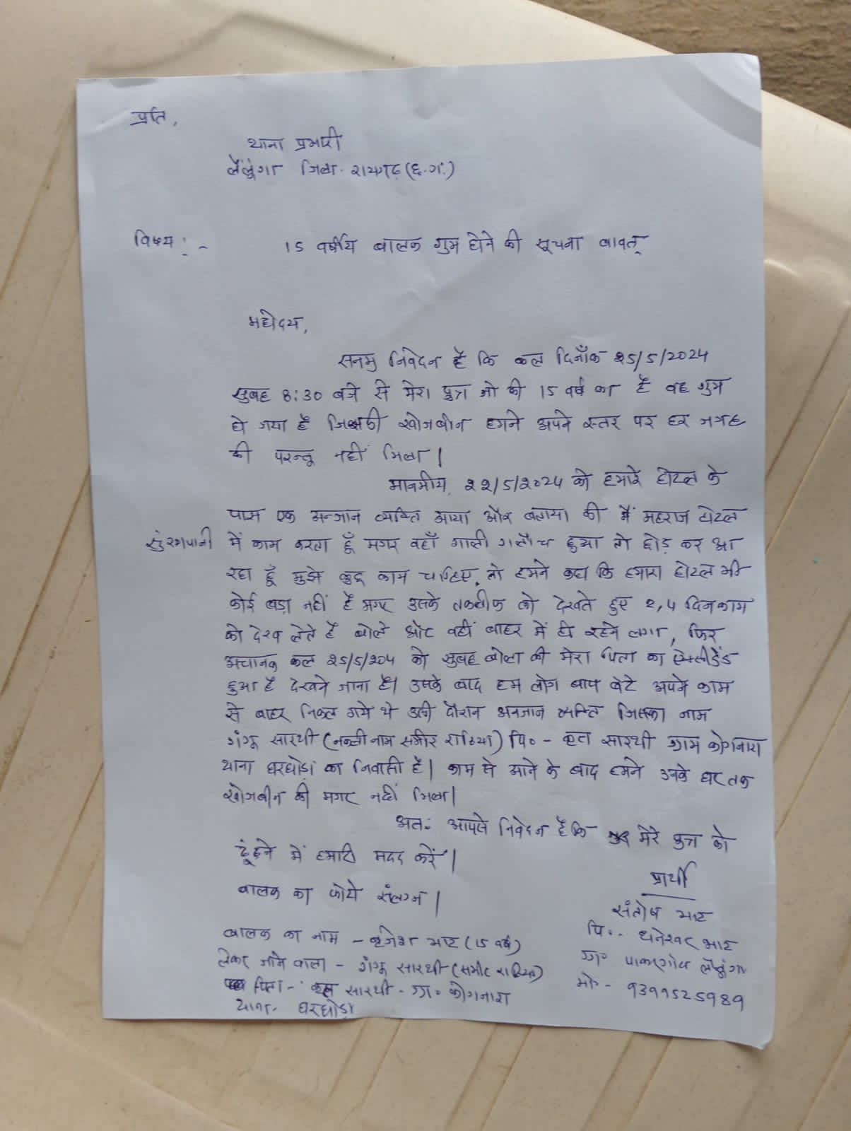 रायगढ़ /ले लूंगा थाना में 14 वर्षी बालक के पिता ने एफ आई आर करते हुए बताया कि मेरे बेटे को होटल में काम करने वाला श्रमिक ने बहला फुसलाकर अपने साथ ले गया है काफी खोज बिन के बाद भी नहीं मिला तो पिता ने ले लूंगा थाना में अर्जी लगाई दरअसल मामला यह है कि संतोष भट्ट होटल चलता है कुछ दिन होटल के पास एक युवक आया और होटल में काम करने की बात कहीं संतोष ने उसे कम पर रख लिया दो-चार दिन काम करने के बाद श्रमिक ने कहा कि उसके पिता का एक्सीडेंट हो गया है उसे देखने जाना है बीते दो-चार दिनों में होटल संचालक के बेटे बृजेश भट्ट 14 वर्ष से दोस्ती कर ली। इस दौरान श्रमिक ने अपना नाम गंगा सारथी कोमनारा बताया था । 25 मई को सुबह 8:30 बजे बृजेश को साथ लेकर टमाटर लेने पकरगांव गया था लेकिन अब तक वापस नहीं लौटा।