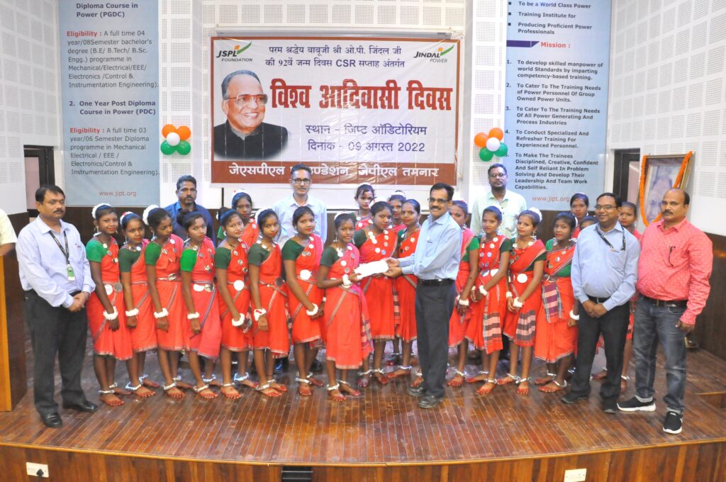 तमनारः- जिंदल पावर लिमिटेड के संस्थापक ओमप्रकाश जिंदल ‘‘बाबूजी‘‘ के जन्मदिवस के अवसर पर आयोजित सीएसआर सप्ताह के तृतीय दिवस एवं 09 अगस्त ’विश्व आदिवासी दिवस 2022’ के अवसर पर जिप्ट आॅडिटोरियम जेपीएल तमनार में आदिवासी संस्कृति व परम्पराओं पर आधारित लोकनृत्य का आयोजन किया। जिसमें शासकीय कन्या उच्चत्तर माध्यमिक विद्यालय गोढ़ी, शासकीय उच्च माध्यमिक विद्यालय राबो एवं कर्मा पार्टी महलोई ने भाग लिया तथा आकर्षक नृन्य प्रस्तुत कर सभी को खुब लुभाया। इस दौरान आदिवासी लोक संस्कृति को बढ़ावा देने के लिए प्रतिभागी टीम को सहायक वाद्ययंत्रों का वितरण किया गया।