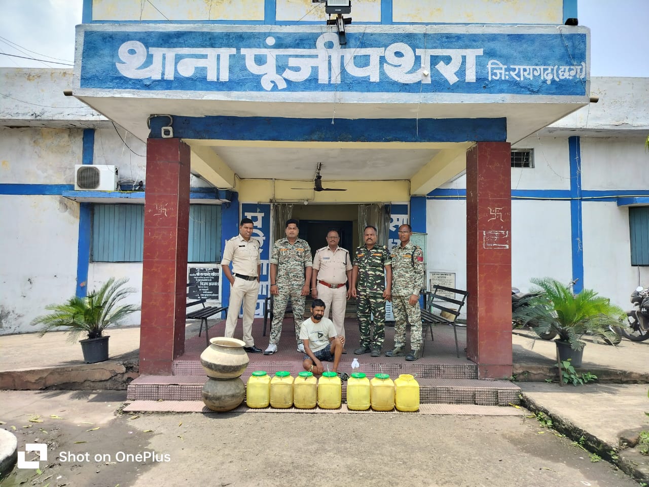 27 जून, रायगढ़ । पुलिस अधीक्षक दिव्यांग कुमार पटेल के अवैध शराब पर अंकुश लगाने के दिये निर्देशों पर कार्यवाही करते हुये थाना प्रभारी पूंजीपथरा निरीक्षक राकेश मिश्रा के नेतृत्व में कल पूंजीपथरा पुलिस द्वारा शराब रेड कार्रवाई कर अवैध शराब कारोबार में संलिप्त व्यक्ति को 105 लीटर अवैध महुआ शराब के साथ पकड़ा गया है ।