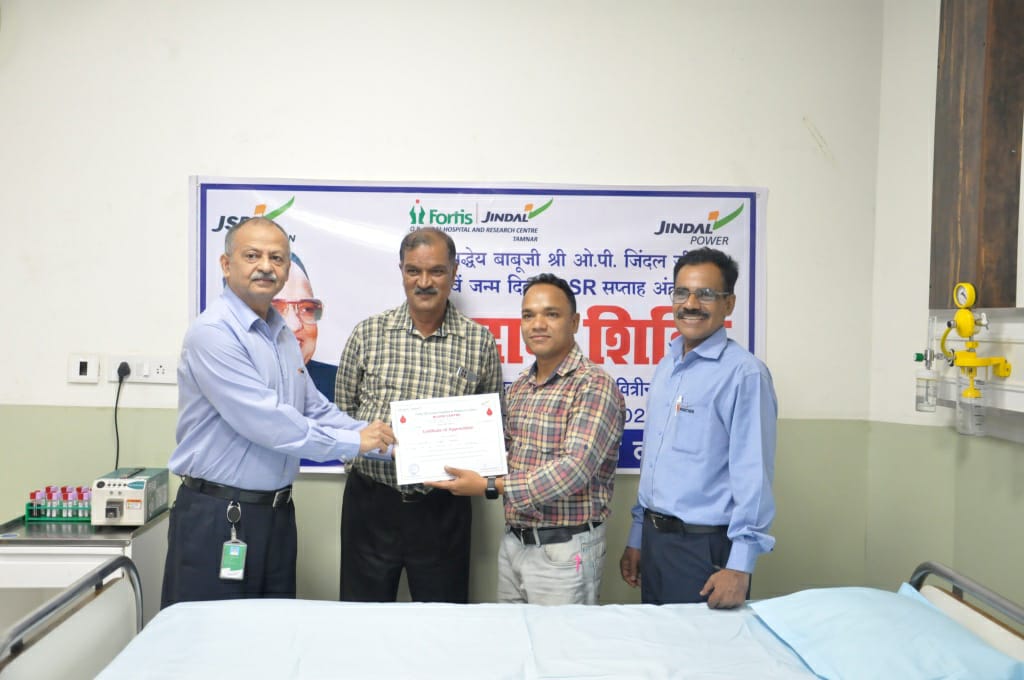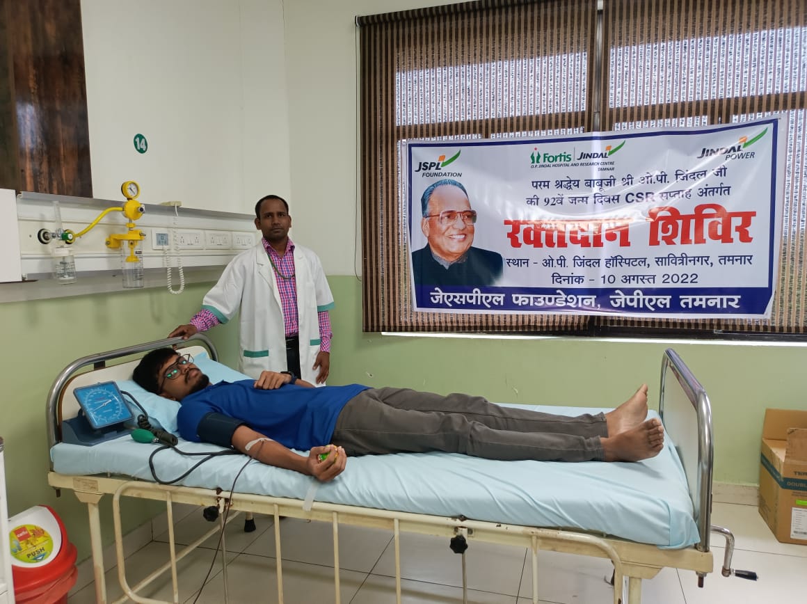 तमनार –श्री ओम प्रकाश जिंदल ‘बाबूजी’ के 92वीं जयंती के अवसर पर आयोजित सीएसआर सप्ताह के चतुर्थ दिवस को उनके सामुदायिक विकास को समर्पित करते हुए जेएसपी फाउंडेशन, जेपीएल तमनार एवं ओपी जिंदल हॉस्पिटल, रेडक्रॉस सोसायटी रायगढ़ और ओपी जिंदल हॉस्पिटल एवं रिसर्च सेंटर सावित्रीनगर एवं रायगढ़ के संयुक्त तत्वाधान में रक्तदान शिविर का आयोजन फोर्टिस ओपी जिंदल हॉस्पिटल रिसर्च सेंटर सावित्रीनगर तमनार में किया गया। जिसमें विभिन्न विभागों के 43 कर्मचारियों ने रक्तदान महादान की उपयोगिता को समझते हुए रक्तदान कर, पुण्य के भागीदार बनें।