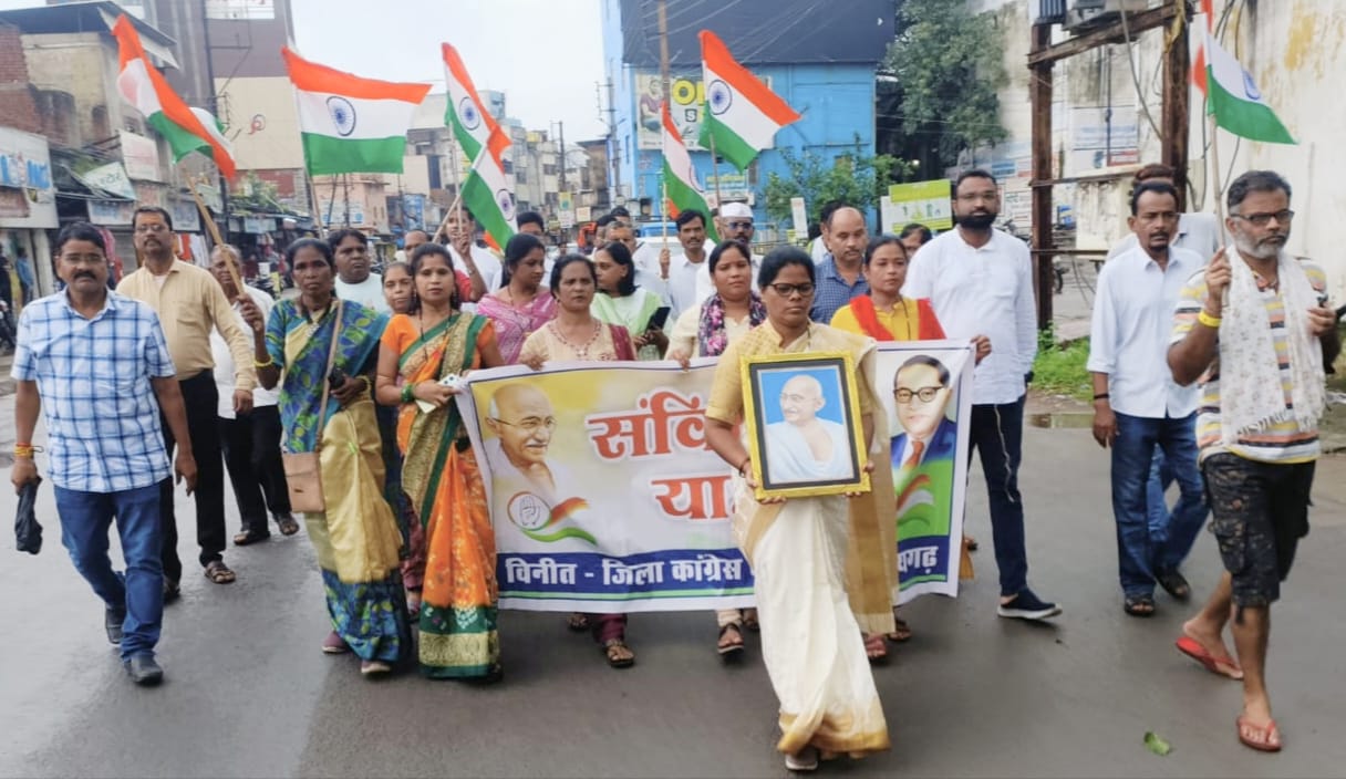 कांग्रेस ने गाँधीजी की तस्वीर व तिरंगा हाथ मे लेकर निकाली संविधान यात्रा