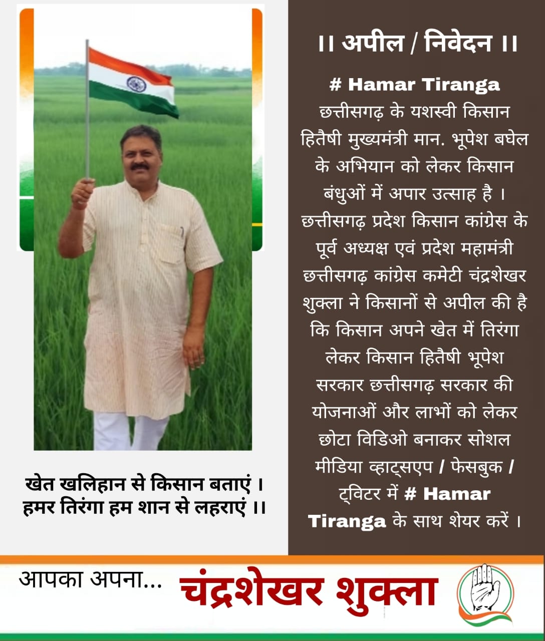 छत्तीसगढ़ प्रदेश किसान कांग्रेस के पूर्व अध्यक्ष एवं प्रदेश महामंत्री छत्तीसगढ़ कांग्रेस कमेटी चंद्रशेखर शुक्ला ने किसानों से अपील की है कि किसान अपने खेत में तिरंगा लेकर किसान हितैषी भूपेश सरकार छत्तीसगढ़ सरकार की योजनाओं और लाभों को लेकर छोटा विडिओ बनाकर सोशल मीडिया व्हाट्सएप / फेसबुक / ट्विटर में # Hamar Tiranga के साथ शेयर करें ।