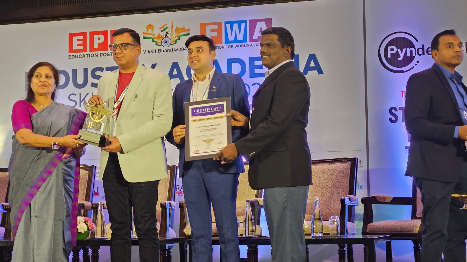 रायगढ़; /ओ.पी. जिंदल विश्वविद्यालय, रायगढ़ को अपनी शैक्षणिक गतिविधियों में उत्कृष्टता, सार्थक साझेदारी के माध्यम से उद्योग के विकास में योगदान, अनुसंधान नवाचार, और वास्तविक दुनिया की चुनौतियों के लिए ज्ञान के अनुप्रयोग के क्षेत्र में उल्लेखनीय कार्य हेतु “बेस्ट यूनिवर्सिटी फॉर एक्सीलेंस इन इंडस्ट्री-एकेडेमिआ कोलैबोरेशन” एवं “लीडिंग प्राइवेट यूनिवर्सिटी फॉर एकेडेमिक एक्सीलेंस” अवार्ड्स से सम्मानित किया गया है। 8 नवम्बर एवं 9 नवम्बर 2024 को नई दिल्ली में आयोजित ‘ZIES अवार्ड प्रोग्राम’ एवं “IIRF इंडस्ट्री एकेडेमिया स्किल कॉन्क्लेव” के दौरान ओपी जिंदल विश्वविद्यालय की ओर से ये पुरस्कार विश्वविद्यालय के कुलपति डॉ आर. डी. पाटीदार ने ग्रहण किया। विश्वविद्यालय ने अकादमिक और उद्योग उत्कृष्टता के प्रति अपनी प्रतिबद्धता को रेखांकित करते हुए इन दो प्रतिष्ठित पुरस्कारों के साथ राष्ट्रीय मान्यता प्राप्त की है।