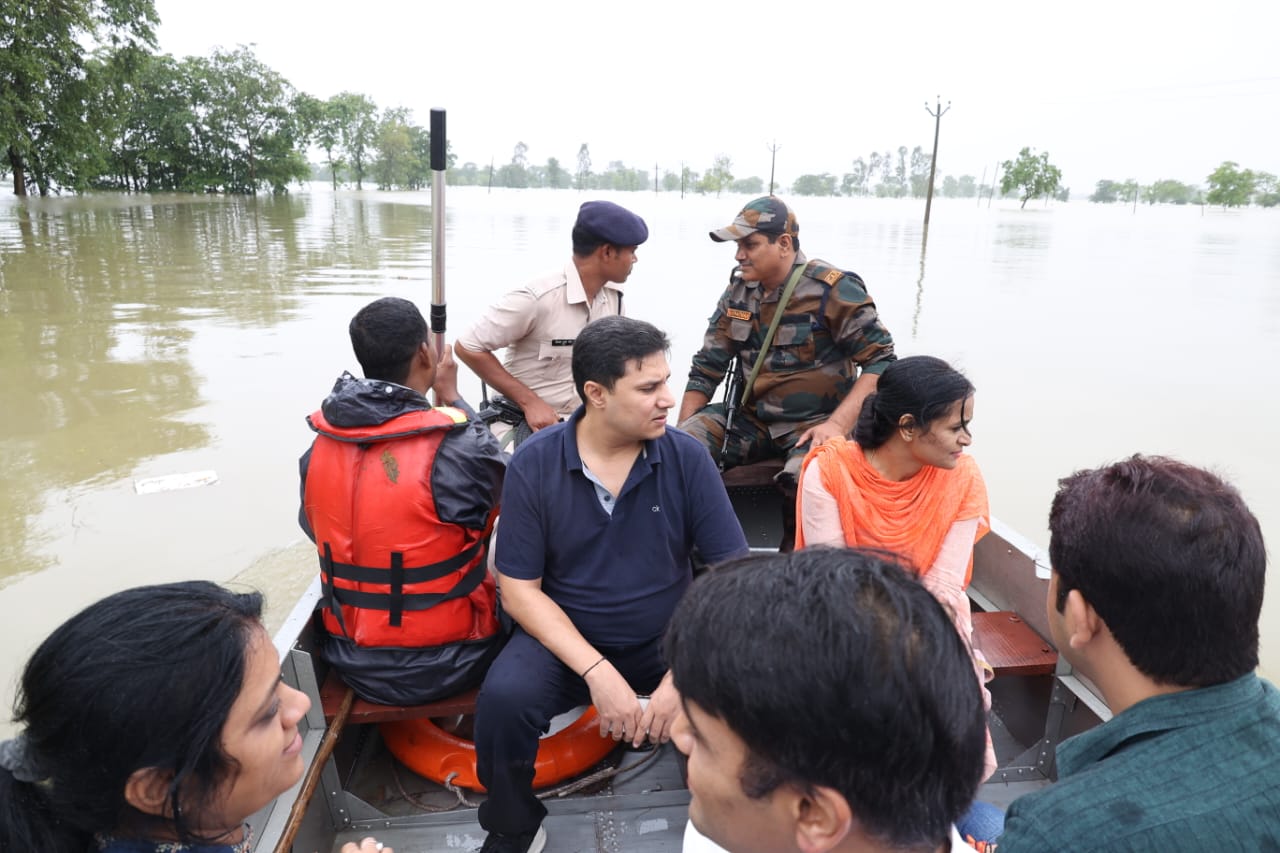 रायगढ़, / जिले में लगातार हो रही बारिश के बीच कलेक्टर श्रीमती रानू साहू और एसपी श्री अभिषेक मीणा आज नाव से बाढ़ प्रभावित इलाकों के निरीक्षण में पहुंचे। विधायक प्रकाश नायक भी इस दौरान साथ रहे। यहां उन्होंने बाढ़ से प्रभावित बस्तियों में जाकर वहां के हालात देखे और राहत एवं बचाव कार्य का जायजा लिया तथा विभागीय अधिकारियों को जरूरी दिशा-निर्देश दिए। सीईओ जिला पंचायत अबिनाश मिश्रा, एसडीएम सारंगढ़ मोनिका वर्मा, डिप्टी कलेक्टर रोहित सिंह, एसडीएम रायगढ़ गगन शर्मा भी इस दौरान उपस्थित रहे।