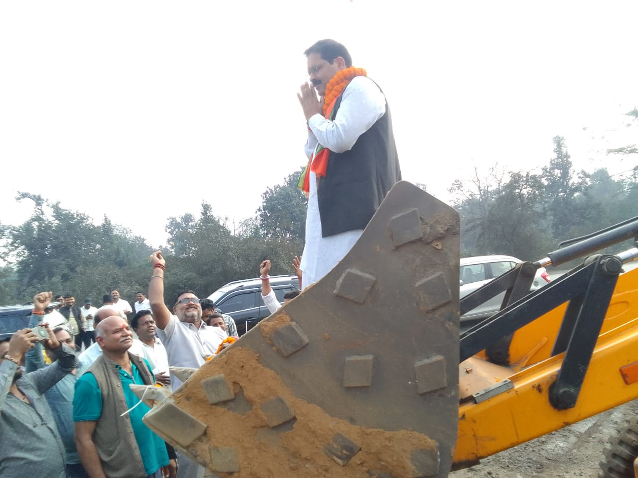 कार्यकर्ताओ ने अपने नए अध्यक्ष को बुलडोजर में चढ़ाकर जोरदार स्वागत किया।बुलडोजर में चढ़कर जब अध्यक्ष ने सभी का अभिवादन किया तो नारो से पूरा आसमान गुंजायमान हो गया।
