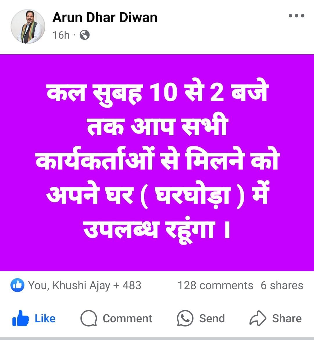 अपने सोशल हेंडल में अरुण धर द्वारा स्वम् इस बात को पोस्ट कर कार्यकर्ताओ के बीच सांझा किया गया कि वे कार्यकर्ताओ की सुनने अपने निवास में बुधवार को सुबह 10 बजे से दोपहर 02 बजे तक उपस्थित रहेंगे।नवनियुक्त अध्यक्ष के पोस्ट के बाद कार्यकर्तावो में अलग ऊर्जा देखने को मिल रहा है।भारतीय जनता पार्टी से जुड़े हर छोटे बड़े कार्यकर्ता के मध्य चर्चा आम है कि अब जिलाध्यक्ष अरुण धर दीवान जी से कार्यकर्ता अपनी मन की बात एवम तकलीफों को बेजीझक कह सकते है।