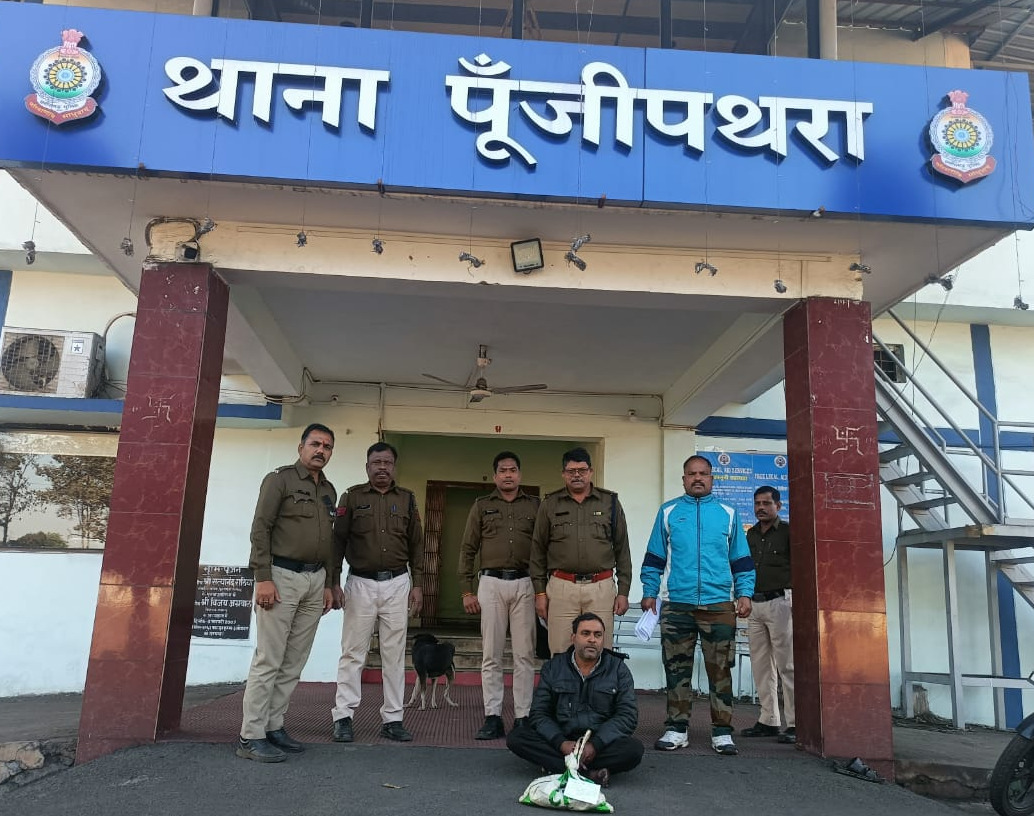 08 जनवरी, रायगढ़ । पूंजीपथरा पुलिस ने मुखबिर की सूचना पर कार्रवाई करते हुए तराईमाल उदय भान कॉलोनी के पास अवैध गांजा बेचने की तैयारी कर रहे व्यक्ति को गिरफ्तार किया गया है। पुलिस ने मौके से 0.902 किलोग्राम गांजा और एक बिना नंबर की मोटरसाइकिल जब्त की है।
