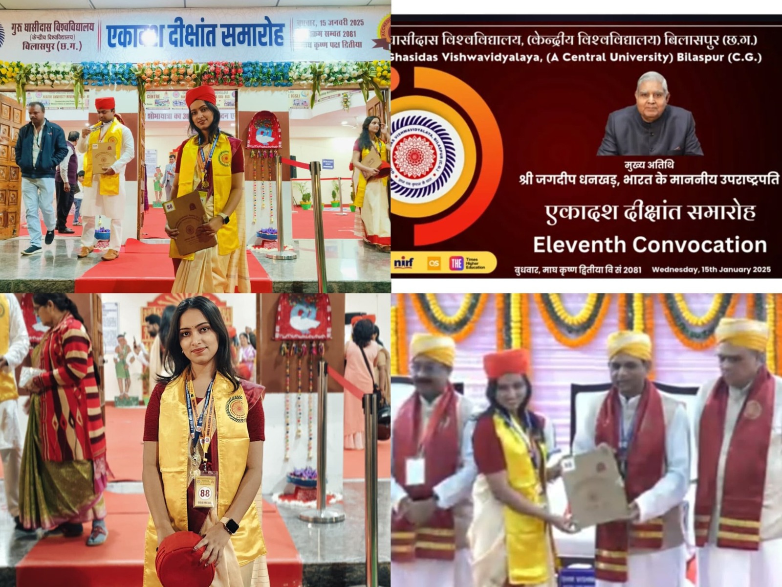 जिन्दल आदर्श ग्राम्य भारती की पूर्व छात्रा कुमारी सिमरन सिंह (बैच – 2018 – 19) ने बी. ए. आनर्स अर्थशास्त्र में स्वर्ण पदक प्राप्त किया है उन्हें यह सम्मान भारत के उपराष्ट्रपति श्री जगदीप धनखड़ ने गुरूघासीदास केन्द्रीय विश्वविद्यालय बिलासपुर के दीक्षांत समारोह ने प्रदान किया। इस समारोह में राज्यपाल रामेन डेका मुख्यमंत्री श्री विष्णुदेव साय सहित केन्द्रीय राज्यमंत्री तोखन साहू और उपमुख्यमंत्री श्री अरूण साव शामिल थे। इस उपलब्धि पर जिंदल आदर्श भारती परिवार ने गर्व व्यक्त किया है। कुमारी सिमरन की यह उपलब्धि युवाओं के लिए प्रेरणा है।