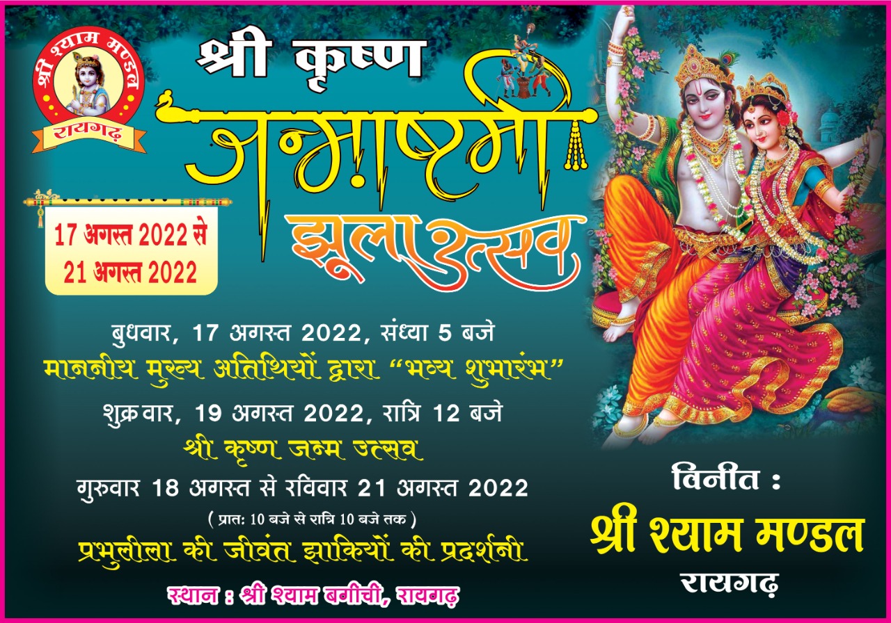 कृष्ण जन्म होगा। श्री श्याम मंडल रायगढ़ के सभी सदस्यों ने रायगढ़ नगर वासियों को अधिक से अधिक संख्या में इस पांच दिवसीय जन्माष्टमी मेले में शामिल होकर आनंद उठाने और 19 अगस्त को जन्माष्टमी के अवसर पर रात्रि 12:00 बजे कृष्ण जन्म उत्सव में शामिल होने की अपील की है।