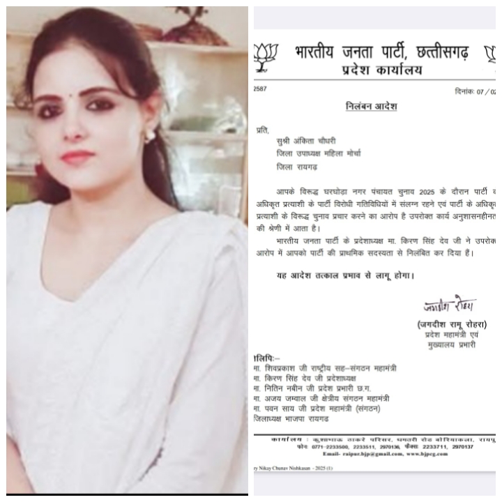 घरघोड़ा / नगरीय निकाय चुनाव को कुछ दिन रह गया है, एक तरफ पार्टी के सदस्य घर घर जाकर पार्टी को जीतने जीतोड़ मेहनत कर रहे है। वही इधर भारतीय जनता पार्टी घरघोड़ा ने पार्टी विरोधी कार्य करने के आरोप में चर्चित भाजपा नेत्री अंकिता चौधरी को बाहर का रास्ता दिखाते हुए सदस्यता निरस्त कर दिया है।भाजपा महिला मोर्चा की जिला उपाध्यक्ष अंकित चौधरी को पार्टी की प्राथमिक सदस्यता से निलंबित कर दिया, घरघोड़ा नगर पंचायत चुनाव में पार्टी के अधिकृत प्रत्याशी के पार्टी विरोधी गतिविधियों में संलग्न रहने एवं पार्टी के अधिकृत प्रत्याशी के विरोध में चुनाव प्रचार करने की वजह से पार्टी के प्रदेश अध्यक्ष ने प्राथमिक सदस्यता से निलंबित कर दिया है।