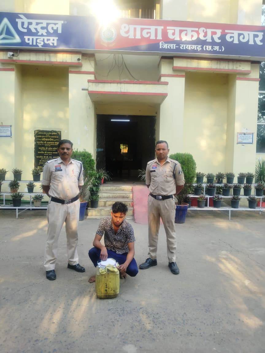 25 मार्च को चक्रधरनगर पुलिस ने ग्राम महापल्ली में शराब रेड की। थाना प्रभारी निरीक्षक प्रशांत राव को सूचना मिली थी कि हेमसागर निषाद (20) अपने कब्जे में अवैध शराब रखकर बिक्री कर रहा है। पुलिस ने दबिश देकर संदेही को पकड़ लिया। प्रारंभ में उसने गुमराह करने की कोशिश की, लेकिन सख्ती से पूछताछ करने पर उसने शराब बिक्री की बात कबूल ली और प्लास्टिक डिब्बे में छिपाकर रखी 06 लीटर कच्ची महुआ शराब (कीमत 1200 रुपये) पेश की।