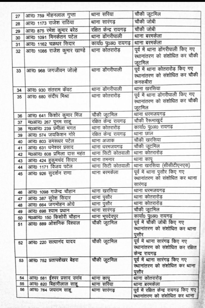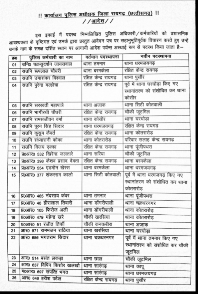 बड़ी खबररायगढ़ Updated: August 17, 2022 रायगढ़ पुलिस विभाग की बड़ी सर्जी….68 पुलिस कर्मियों को स्थानांतरण… By ज्योति ठाकुर August 17, 2022 179 0 Share FacebookTwitterPinterestVKWhatsApp Must Read रायगढ़ज्योति ठाकुर - December 5, 2025अग्निवीर चयन परीक्षा में तमनार के श्रीजेश की सफलता; अदाणी फाउंडेशन की पहल से सपनों को मिला पंख रायगढ़ज्योति ठाकुर - December 4, 2025एनटीपीसी लारा की पहल से शिक्षा की शक्ति से सपनों को उड़ान मिले रायगढ़ज्योति ठाकुर - December 4, 2025जिंदल आशा, जिंदल फाउंडेशन, जेपीएल तमनार में ’विश्व दिव्यांगजन दिवस 2025’ का आयोजन…प्रतिभाशाली बच्चों ने अपने में निहित प्रतिभा का किया प्रदर्शन ज्योति ठाकुरhttp://indradhanushnews.in रायगढ़ / आज जिला प्रशासन के बाद पुलिस विभाग में भी कप्तान ने 68 पुलिस कर्मियों को स्थानांतरण किया है। जिले के कई थानों में पदस्थ उप निरीक्षक, सहायक उपनिरीक्षक, प्रधान आरक्षक और आरक्षकों का ट्रांसफर आर्डर जारी किया है। Share FacebookTwitterPinterestVKWhatsApp Previous articleनिगम परिसर में महापौर ने किया ध्वजारोहण…Next articleसांस्कृतिक प्रकोष्ठ जिला कांग्रेस संगठन में 14 कलाकारो ने लिया सदस्यता Latest News रायगढ़ज्योति ठाकुर - December 5, 2025अग्निवीर चयन परीक्षा में तमनार के श्रीजेश की सफलता; अदाणी फाउंडेशन की पहल से सपनों को मिला पंखरायगढ़, 5 दिसम्बर 2025: /देश सेवा का सपना देखने वाले तमनार ब्लॉक के श्रीजेश डोलेसरा ने भारतीय सेना के... रायगढ़ एनटीपीसी लारा की पहल से शिक्षा की शक्ति से सपनों को उड़ान मिले ज्योति ठाकुर - December 4, 2025 रायगढ़ जिंदल आशा, जिंदल फाउंडेशन, जेपीएल तमनार में ’विश्व दिव्यांगजन दिवस 2025’ का आयोजन…प्रतिभाशाली बच्चों ने अपने में निहित प्रतिभा का किया प्रदर्शन ज्योति ठाकुर - December 4, 2025 रायगढ़ रायगढ़ में उस्मान का हुआ स्वागत, तत्पश्चात युवा कांग्रेस की बड़ी बैठक ,नई जिम्मेदारियों, दिल्ली दौरा को लेकर रणनीति तय,कार्यकारिणी गठन पर चर्चा ज्योति ठाकुर - December 4, 2025 रायगढ़ संस्कार ने जीता ओपी जिंदल यूनिवर्सिटी स्पर्धा 2:0 का ख़िताब…सेजेस टारपाली को आसानी से हराया ज्योति ठाकुर - December 4, 2025 More Articles Like This अग्निवीर चयन परीक्षा में तमनार के श्रीजेश की सफलता; अदाणी फाउंडेशन की पहल से सपनों को मिला पंख रायगढ़ ज्योति ठाकुर - December 5, 2025 एनटीपीसी लारा की पहल से शिक्षा की शक्ति से सपनों को उड़ान मिले रायगढ़ ज्योति ठाकुर - December 4, 2025 जिंदल आशा, जिंदल फाउंडेशन, जेपीएल तमनार में ’विश्व दिव्यांगजन दिवस 2025’ का आयोजन…प्रतिभाशाली बच्चों ने अपने में निहित प्रतिभा का किया प्रदर्शन रायगढ़ ज्योति ठाकुर - December 4, 2025 रायगढ़ में उस्मान का हुआ स्वागत, तत्पश्चात युवा कांग्रेस की बड़ी बैठक ,नई जिम्मेदारियों, दिल्ली दौरा को लेकर रणनीति तय,कार्यकारिणी गठन पर चर्चा रायगढ़ ज्योति ठाकुर - December 4, 2025