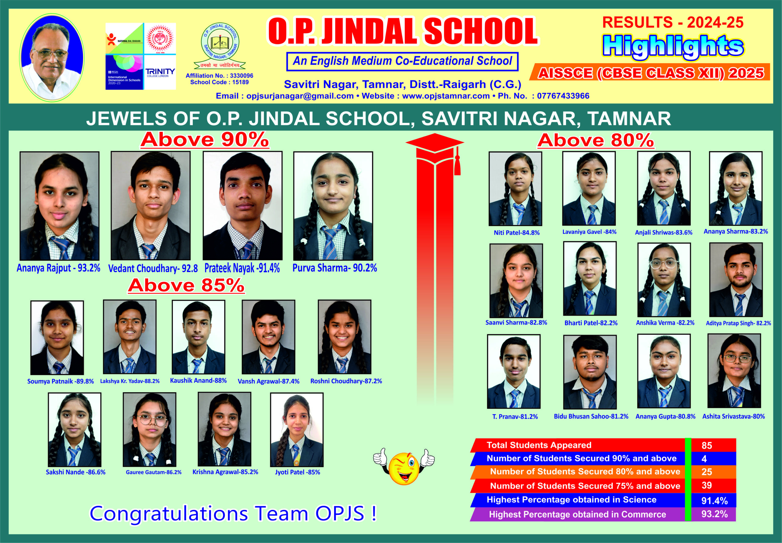 ज्ञात रहे कि ओ0पी0जिंदल स्कूल सावित्रीनगर तमनार विगत वर्षों से बोर्ड परीक्षा में श्रेष्ठ परिणामों के लिए उल्लेखनीय रहा तथा पूरे प्रदेश में अपनी अलग पहचान बनाई है। विद्यालय अपने गरिमामय अनुशासन एवं उच्चकोटि के शिक्षक एवं शिक्षिकाओं की मदद से ऐेसे परिणाम हासिल करता आ रहा है। इस गौरान्वित करने वाली उपलब्धि पर जिंदल पावर लिमिटेड के यूनिट हेड गजेंद्र रावत विद्यालय प्रबंधन समिति के अध्यक्ष, संदीप सांगवान मानव संसाधन एवं कर्मचारी सेवाएँ,समूह प्रमुख ऊर्जा के साथ समस्त जिंदल परिवार व क्षेत्रवासियों ने हर्ष व्यक्त किया तथा सफल विद्यार्थियों को उनकी इस उत्कृष्ट सफलता पर बधाई दी। शाला के प्राचार्य राकेश शर्मा ने कहा कि उक्त सफलता का श्रेय विद्यार्थियों के कठिन परिश्रम, प्रबंधन समिति के सतत सहयोग, शिक्षकों के मार्गदर्शन, अभिभावकों व क्षेत्रवासियों के सहयोग से ही संभव हुआ है।