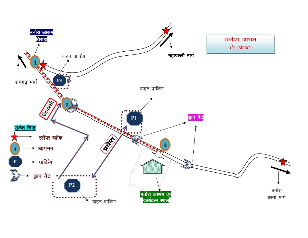 इसी क्रम में गुरु पूर्णिमा के दिन ग्राम बनोरा स्थित अघोर गुरूपीठ बनोरा आश्रम में आने वाले श्रद्धालुओं के लिए यातायात पुलिस द्वारा 3 अलग-अलग पार्किंग स्थलों की व्यवस्था की गई है। इन पार्किंग स्थलों पर दोपहिया एवं चारपहिया वाहनों के लिए उचित स्थान सुनिश्चित किया गया है ताकि दर्शन हेतु आने-जाने में किसी प्रकार की बाधा न हो और यातायात प्रणाली भी सुचारु बनी रहे।