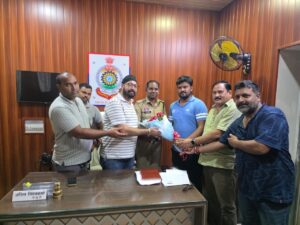 बीते दिनों हुवे श्याम मंदिर में चोरी के मामले में जिस प्रकार से इतने जल्दी चोर को गिरफ्तार किया,और साथ ही साथ चोरी हुवे श्याम बाबा के सभी आभूषणों को बरामद किया,उसी के समान में रायगढ़ जिला ट्रेलर मालिक कल्याण संघ के द्वारा पुलिस अधीक्षक,और नगर पुलिस अधीक्षक से मिलकर गुलदस्ता देकर सम्मानित किया,और पूरे पुलिस विभाग का धन्यवाद दिया।