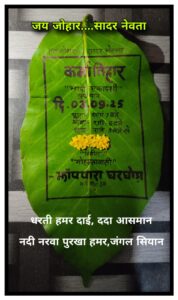 प्राकृतिक रूप से मनाए जाने वाले इस पर्व को लेकर कवर सराई पान के पत्ते में विधिवत आयोजन की रूपरेखा आकर्षक तरीके से बनाकर रायगढ़ लोकसभा सांसद राधेश्याम राठिया व विधायक लालजीत राठिया को आमंत्रित किया गया।
