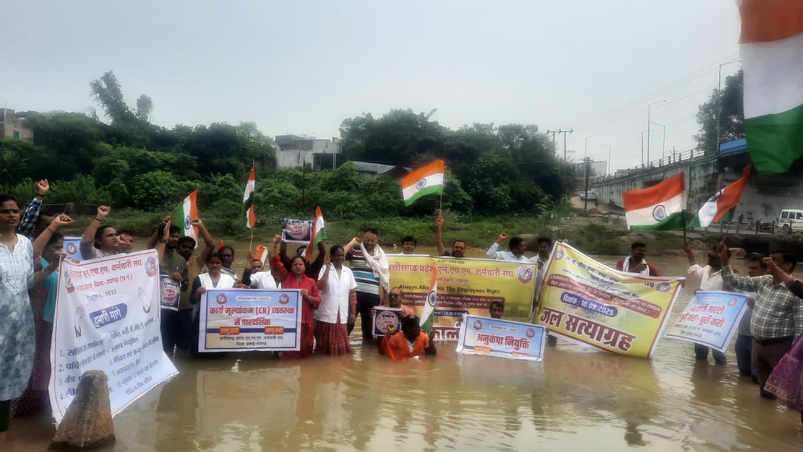 रायगढ़ : 10 सितंबर 2025 छत्तीसगढ़ के राष्ट्रीय स्वास्थ्य मिशन (एनएचएम) कर्मचारी, जो 20 वर्षों से स्वास्थ्य सेवाओं की रीढ़ बने हुए हैं, आज भी अपनी 10 सूत्रीय मांगों को लेकर सड़कों पर हैं। 18 अगस्त 2025 से शुरू अनिश्चितकालीन हड़ताल का आज 24वां दिन है, लेकिन सरकार की ओर से केवल आश्वासनों की बौछार और बर्खास्तगी की तलवार लटक रही है। आज सैकड़ों कर्मचारियों ने तिरंगा झंडा और तख्तियों के साथ जल सत्याग्रह कर सरकार को “सद्बुद्धि” की प्रार्थना की, नारे गूंजे: *”रघुपति राघव राजा राम, सरकार को सद्बुद्धि दे भगवान!”* और *”ईश्वर अल्लाह तेरो नाम, सरकार को सन्मति दे भगवान!”*
