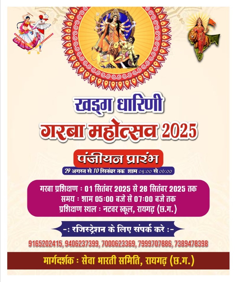 रायगढ़:- भारतीय संस्कृति एवं परंपरा को संजोकर रखते हुए अनेक धार्मिक ,सांस्कृतिक एवं सामाजिक आयोजन करने में अग्रणी महिला समन्वय रायगढ़ द्वारा लगातार *तृतीय वर्ष खड़्ग धारिणी गरबा* की तैयारी की जा रही है। इस आयोजन के लिए पंजीयन आरंभ हो चुका है ।इसके अंतर्गत 1 सितंबर से 28 सितंबर तक *नटवर स्कूल डोम* में बालिकाओं युवतियों एवं महिलाओं को गरबा का प्रशिक्षण दिया जा रहा है।