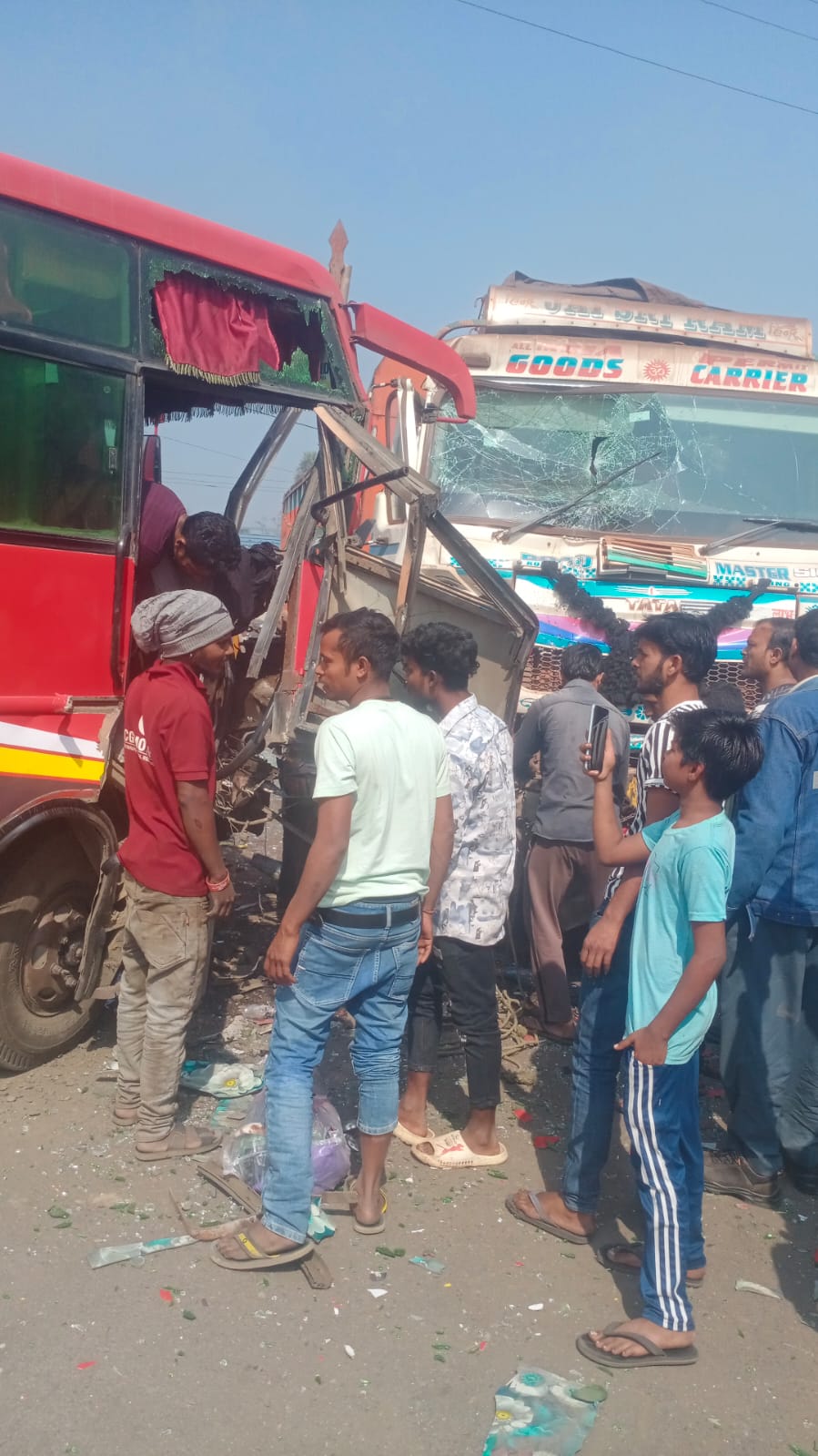 रायगढ़ / आज सुबह 11:30 बजे केवड़ाबाड़ी बस स्टैंड से यात्रियों से भरी सक्षम बस घरघोड़ा जाने के लिए रवाना हुई लाख चिराईपानी मार्ग के पास सामने से तेज रफ्तार में दौड़ती हुई ट्रक ने सवारी बस को जोरदार टक्कर मारी, टक्कर इतनी भयानक थी कि बस के सामने का हिस्सा पूरी तरह क्षतिग्रस्त हो गया, ट्रक ड्राइवर घटनास्थल से फरार बताया जा रहा है। बस में सवार 15 मुसाफिर गंभीर रूप से घायल हुए हैं। इस घटना की सूचना मिलते ही तत्काल घटना स्थल पर एडिशनल एसपी सहित कोतवाली टीआई अपनी टीम के साथ मौके पर पहुंचे जहां दो से तीन एंबुलेंस की सहायता से रायगढ़ जिला अस्पताल और मेडिकल कॉलेज में सभी घायलों को भर्ती कराया गया है जहां उनका इलाज किया जा रहा है। कई लोग गंभीर रूप से घायल भी हुए हैं इस सड़क दुर्घटना में।