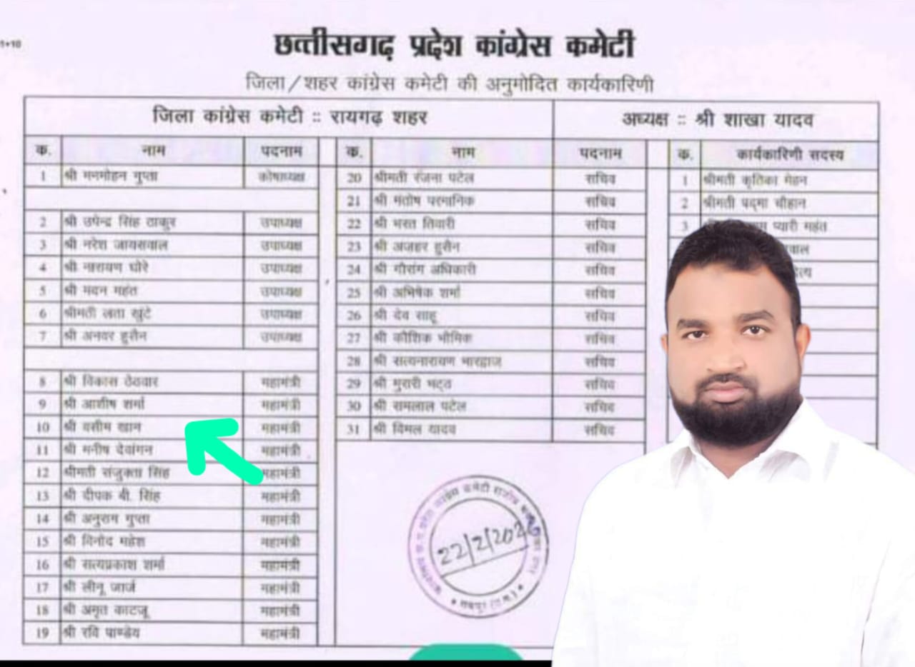 रायगढ़। छत्तीसगढ़ प्रदेश कांग्रेस कमेटी द्वारा रायगढ़ शहर जिला कांग्रेस कमेटी के नए पदाधिकारियों की बहुप्रतीक्षित सूची जारी कर दी गई है। छत्तीसगढ़ प्रदेश कांग्रेस कमेटी के निर्देश पर जारी इस सूची में 31 नेताओं को संगठन की अहम जिम्मेदारियां सौंपी गई हैं। इसी क्रम में कांग्रेस के सक्रिय और कर्मठ नेता वसीम खान को शहर जिला कांग्रेस कमेटी का महामंत्री नियुक्त किया गया है। उनकी नियुक्ति से संगठन में नई ऊर्जा और जोश का संचार देखा जा रहा है।