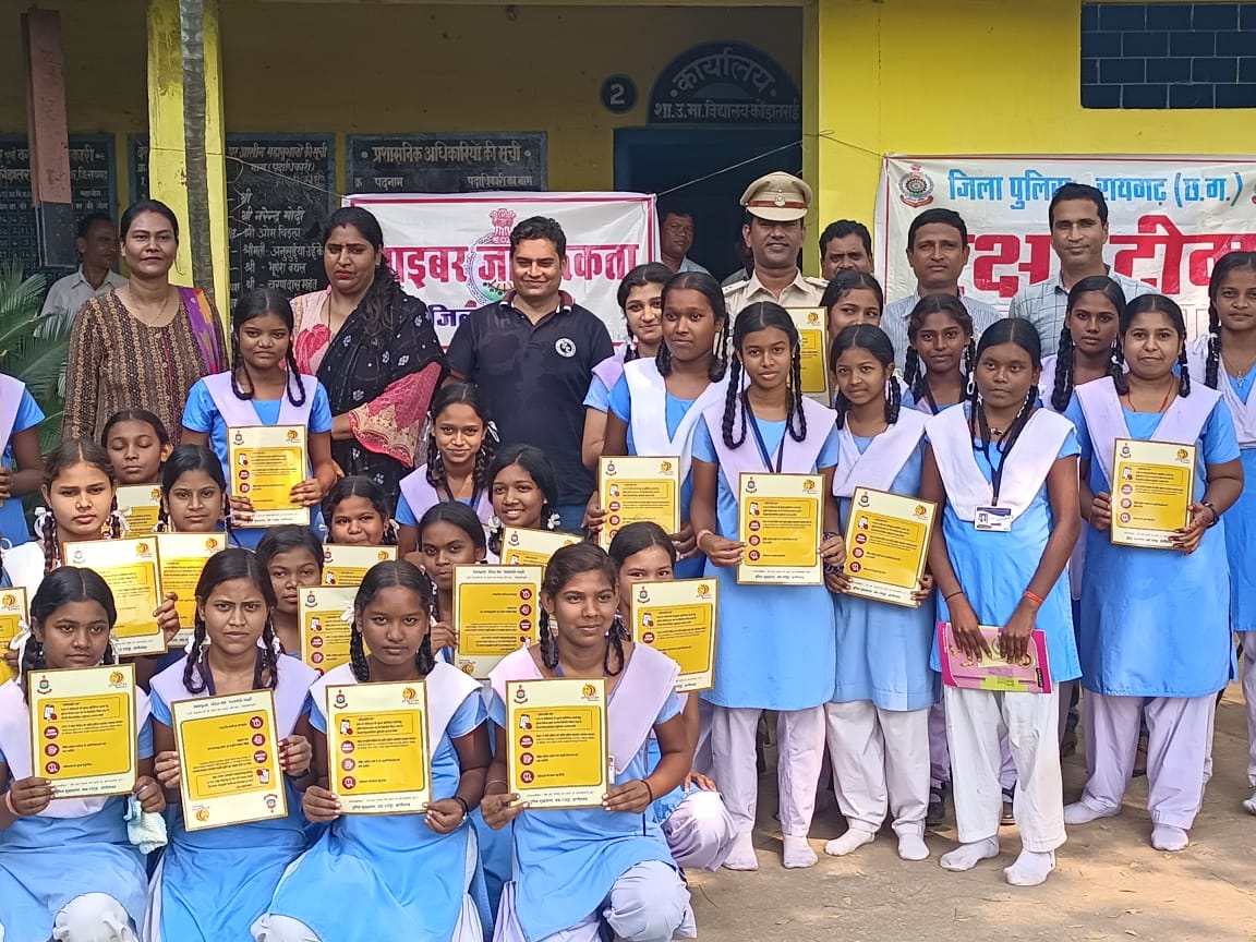 रायगढ़। साइबर क्राइम, सड़क दुर्घटना और महिलाओं के विरूद्ध अपराधों लेकर संवेदनशील एसपी रायगढ़ श्री अभिषेक मीना के दिशा निर्देशन पर माह के प्रथम बुधवार को “साइबर जागरूकता दिवस” के रूप में जागरूकता कार्यक्रम आयोजित किये जा रहे हैं । इसी क्रम में आज दिनांक 07.09.2022 को साइबर सेल, महिला रक्षा टीम और यातायात पुलिस के संयुक्त तत्वाधान में चौकी जुटमिल अंर्तगत हायर सेकेण्डरी स्कुल कोंडातराई तथा ग्राम ननसिया हायर सेकेण्डरी स्कुल में शिक्षकगण के लिए आयोजित प्रशिक्षण कार्यक्रम में सायबर अवेयरनेस कार्यक्रम-02 आयोजित किया गया ।