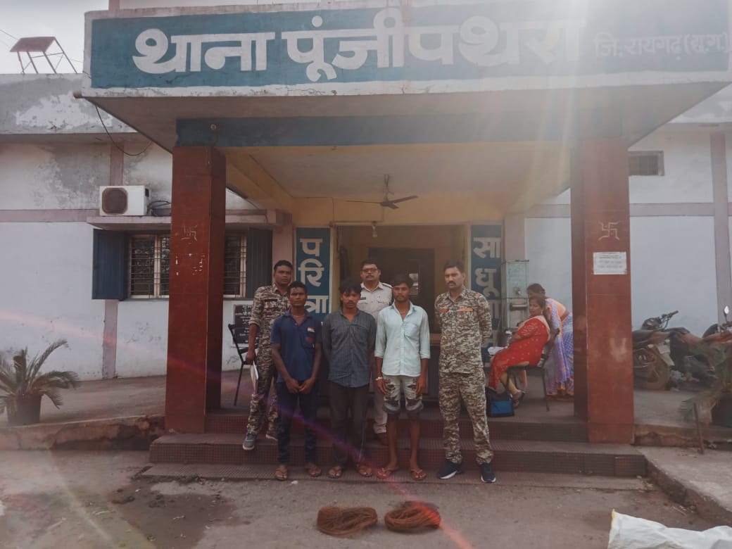 रायगढ़ । आज दिनांक 24.09.2022 को पूंजीपथरा पुलिस द्वारा आपराधिक मानव वध के आरोप में ग्राम हर्राडीह, पूजीपथरा के तीन युवकों को गिरफ्तार कर न्यायिक रिमांड पर भेजा गया है । तीनों आरोपी अपने साथी युवक के साथ हर्राडीह जंगल बिजली करेंट से जंगली जानवर मारने खुला तार में करेंट प्रवाहित किये थे । उसी तार में आरोपियों के साथी लोकनाथ राठिया का हाथ फंस जाने और उसको बिजली करेंट मारने से मौके पर ही मौत हो गया था ।