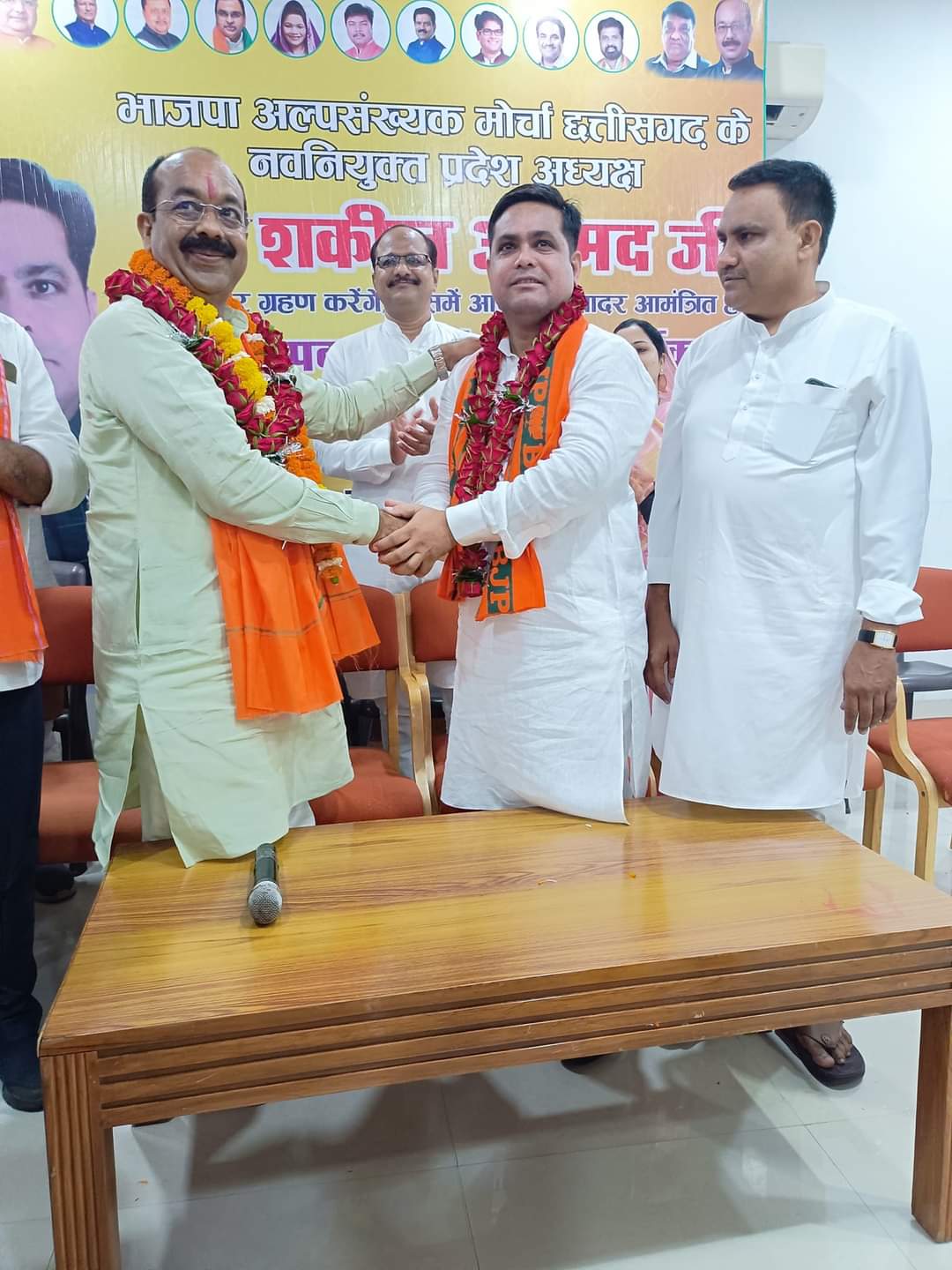 रायपुर – आज छत्तीसगढ़ भाजपा अल्पसंख्यक मोर्चा के नव नियुक्त प्रदेश अध्यक्ष शकील अहमद द्वारा पदभार ग्रहण प्रदेश भाजपा कार्यालय, कुशाभाऊ ठाकरे परिसर, बोरियाकला, रायपुर में किया गया।इस अवसर नवनियुक्त प्रदेश अध्यक्ष श्री शकील अहमद ने कहा कि अल्पसंख्यक मोर्चा प्रदेश के हर अल्पसंख्यक बूथों में कार्य करेगा व केंद्र की माननीय मोदी सरकार की नीति सबका साथ सबका विकास सबका विश्वास को अल्पसंख्यक वर्ग तक पहुंचाएंगे साथ ही छत्तीसगढ़ की भूपेश सरकार विफलता को भी जन जन तक पहुंचाना है।कार्यक्रम को भाजपा प्रदेश अध्यक्ष अरूण साव जी, ने कहा की छत्तीसगढ़ की झूठी लबरी सरकार को उखाड़ फेकना है और 2023 में बीजेपी की सरकार बनाना है
