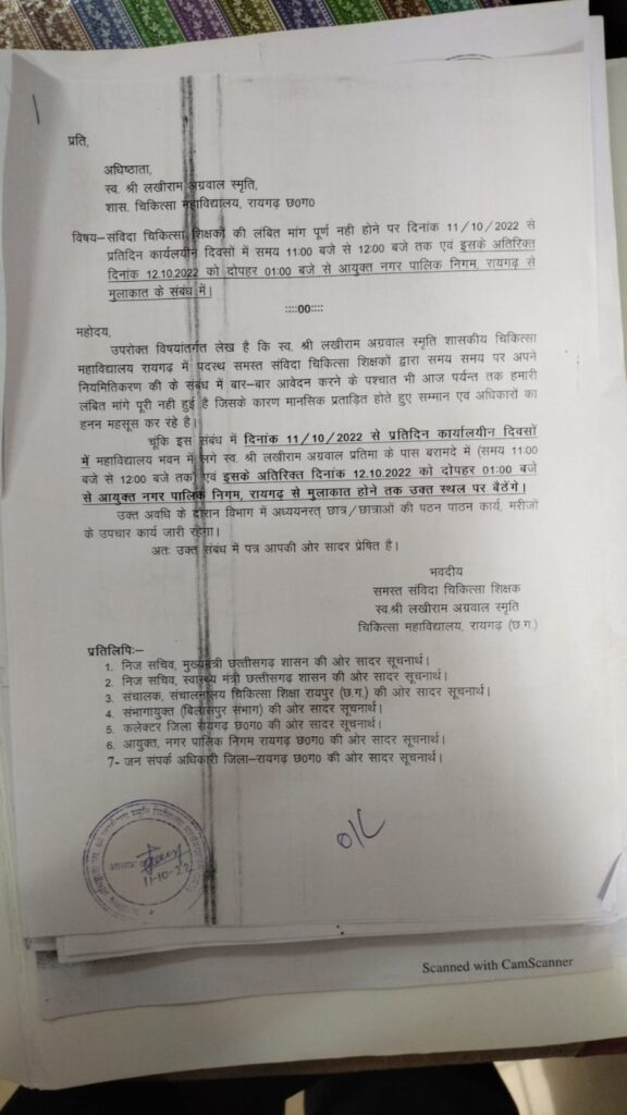 थे। उन्हें आश्वासन दिया गया था। की उनकी सभी मांगों को पूरा किया जाएगा, लेकिन आज पर्यंत तक भी उनकी मांगे पूरी नहीं होने पर एक बार फिर धरने पर बैठे हैं 10 से 12 कर्मचारी मेडिकल कॉलेज के लखीराम अग्रवाल प्रतिमा के पास बरामदे में सभी बैठे हुए हैं। चिकित्सा शिक्षकों के धरने पर बैठने से मेडिकल कॉलेज की व्यवस्था पूरी तरह से चरमरा गई है। सभी मरीजों को काफी परेशानियों का सामना करना पड़ रहा है।
