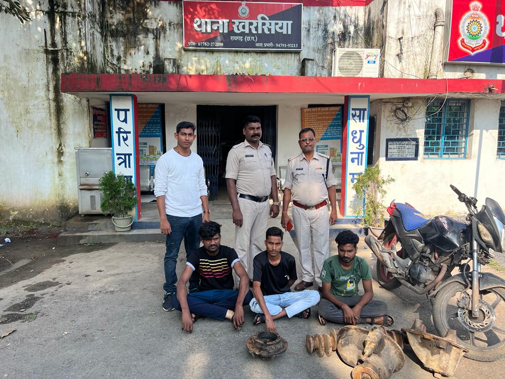 माल, मुलजिम पतासाजी दौरान प्रार्थी व मुखबिर से मिली जानकारी के आधार पर क्षेत्र के संदिग्ध टेकलाल पटेल निवासी बोतल्दा का पता तलाश कर रात्रि गश्त घेराबंदी कर संदेही को हिरासत में लिया गया जो कड़ी पूछताछ में अपने गांव के शिवा उर्फ सिद्धेश्वर दास वैष्णव के साथ शिवा के मोटरसाइकिल CBZ स्ट्रीम से अपने एक और साथी राहुल कुमार साहू निवासी बानीपाथर के साथ दिनांक 12.10.2022 की रात्रि पैसे की आवश्यकता पर रानीसागर चौंक के पास एक गोदाम का ताला को तोड़कर गोदाम में रखे ट्रेलर वाहन का पुराना लोहे का पार्ट्स तीन टुकड़ा (वजन करीब 80 किलो कीमत ₹3000) का चोरी कर मोटर सायकल से लाना और ओवर ब्रिज के पास झाड़ियों में छुपा कर रखना बताया । आरोपी टेकलाल पटेल से मिली जानकारी पर उसके साथी आरोपी शिवा उर्फ सिद्धेश्वर दास वैष्णव और राहुल कुमार साहू को हिरासत में लिया गया । आरोपियों के मेमोरेंडम पर ट्रेलर वाहन का पुराना क्राउन वजन करीब 80 किलो कीमत ₹3000, घटना में प्रयुक्त मोटरसाइकिल CBZ स्ट्रीम, एक नग टूटा हुआ गोदाम का ताला जप्त कर आरोपियों को नकबजनी के अपराध में गिरफ्तार कर न्यायिक रिमांड पर भेजा गया है । आरोपियों की पतासाजी गिरफ्तारी में थाना प्रभारी खरसिया उपनिरीक्षक नंदकिशोर गौतम, सहायक उपनिरीक्षक हेमंत कश्यप और आरक्षक योगेश साहू की प्रमुख भूमिका रही है ।
