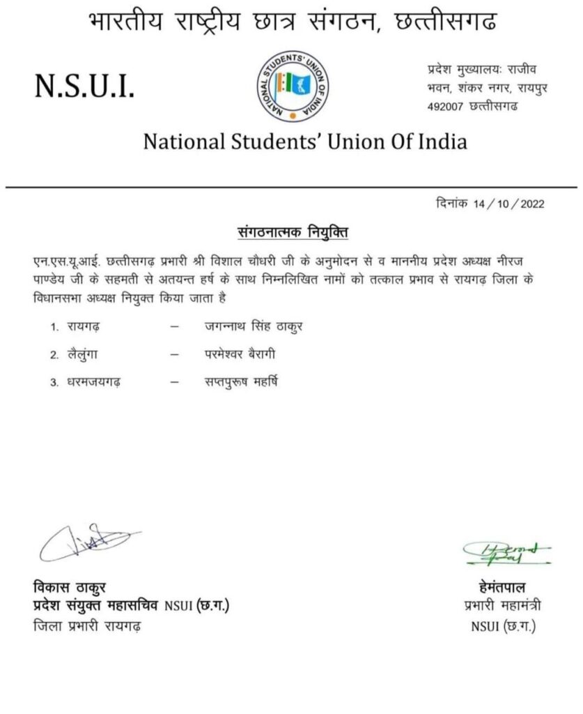 छत्तीसगढ़ प्रदेश NSUI ने प्रदेश के सभी विधानसभा में विधानसभा अध्यक्ष की नियुक्ति की प्रदेश प्रभारी विशाल चौधरी है और प्रदेश अध्यक्ष नीरज पांडे ने अध्यक्षों की घोषणा की रायगढ़ ज़िले के रायगढ़ विधानसभा से जगन्नाथ सिंह ठाकुर उर्फ़ जग्गू ठाकुर लैलूंगा