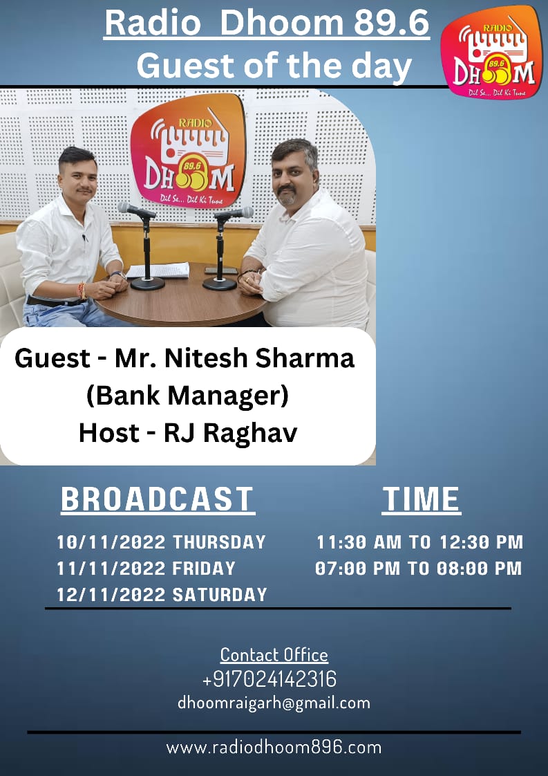 शहर के युवा बैंकर तथा निजी क्षेत्र के अग्रणी बैंक के मुख्य शाखा प्रबंधक नितेश शर्मा "'रेडियो धूम 89.6"' में प्रसारित होने वाले कार्यक्रम गेस्ट ऑफ द डे' होंगे। इस कार्यक्रम में वे बैंकिंग व वित्तीय सेवाओं की तकनीकी व अन्य बारीकियों की जानकारी देंगे। करीब एक घंटे तक प्रसारित होने वाले इस कार्यक्रम में उनकी पसंद के गाने भी सुनाए जाएंगे। इस कार्यक्रम की पूरी रिकार्डिंग हो चुकी है। 10, 11 व 12 नवंबर को सुबह 11.30 से 12.30तक तथा शाम 7 बजे से रात 8 बजे तक आप आरजे राघव के साथ उनकी मजेदार बातचीत व सुमधुर गीत-संगीत का आनंद उठा सकेंगे।