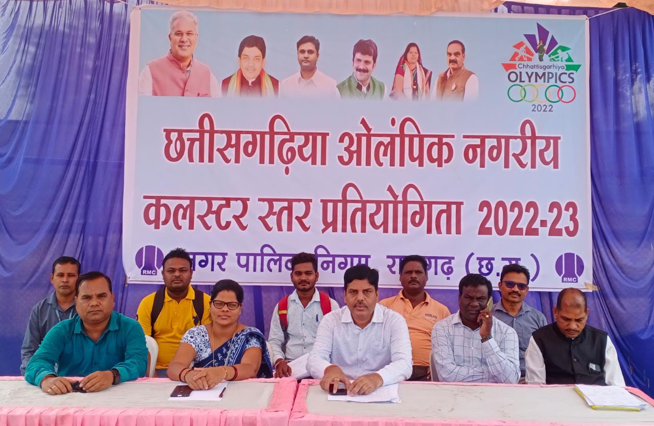 रायगढ़ / छतीसगढ़िया ओलंपिक नगरीय क्लस्टर स्तरीय प्रतियोगिता रायगढ़ स्टेडियम में तीन खेलो पर वर्ग वॉर एवं समय वॉर नगर निगम के महापौर जानकी काट्जू एवं डिप्टी कमिश्नर सुतीक्षण यादव तथा एम आई सी सदस्य विकास ठेठवार,पार्षद प्रतिनिधि शाखा यादव,अमृत काट्जू