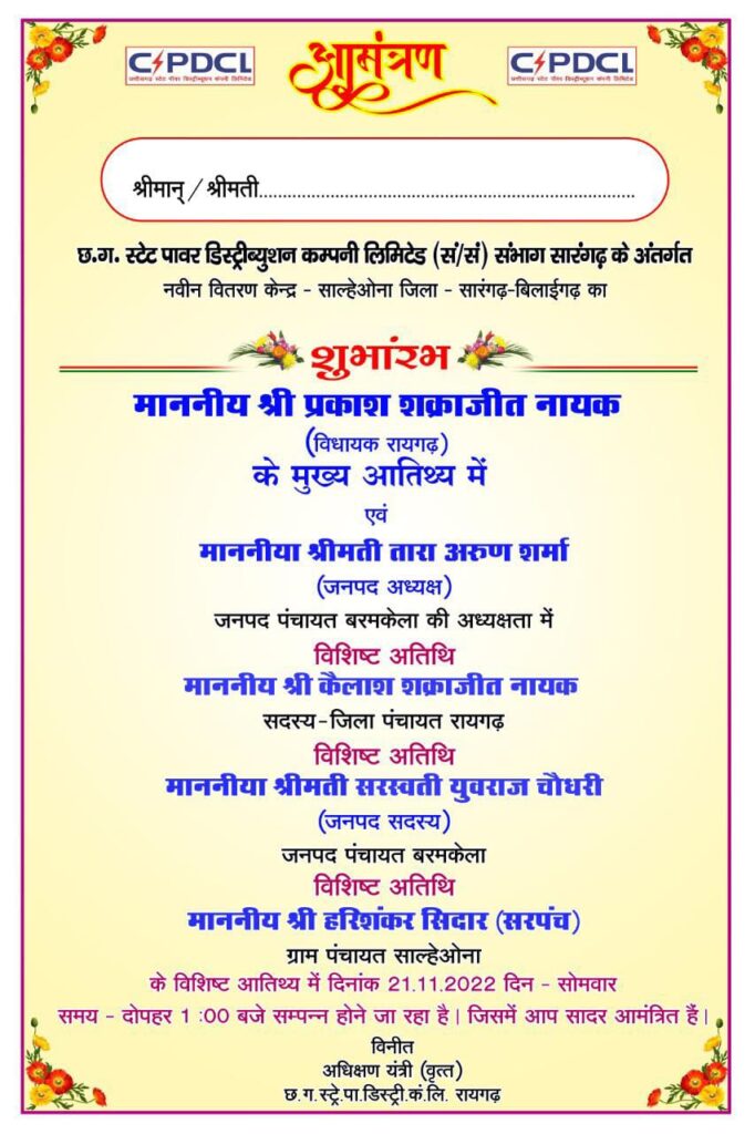 सरिया / साल्हेओना आज दिनाँक 21 नवम्बर दोपहर 2 बजे सारंगढ़ बिलाईगढ़ जिला बरमकेला ब्लॉक के अंतर्गत सरिया क्षेत्र मे आने वाले ग्राम साल्हेओना मे छ. ग. स्टेट पावर डिस्ट्रिव्युसंन कंपनी लिमिटेड संभाग सारंगढ़ के अंतर्गत साल्हेओना मे नवीन विद्युत वितरण केंद्र का शुभारंभ हमारे रायगढ़ विधानसभा क्षेत्र के होंनहार युवा लोकप्रिय विधायक श्री प्रकाश नायक जी के हाथों संपन्न हुआ विधायक नायक मुख्य अतिथि व विशिष्ट अतिथियों सहयोगी साथियों की उपस्थिति मे साल्हेओना मे नवीन वितरण केंन्द्र का शुभारंभ हुआ।